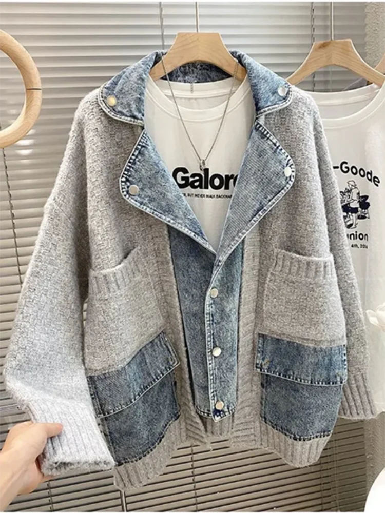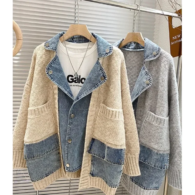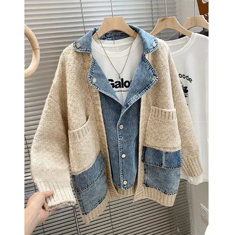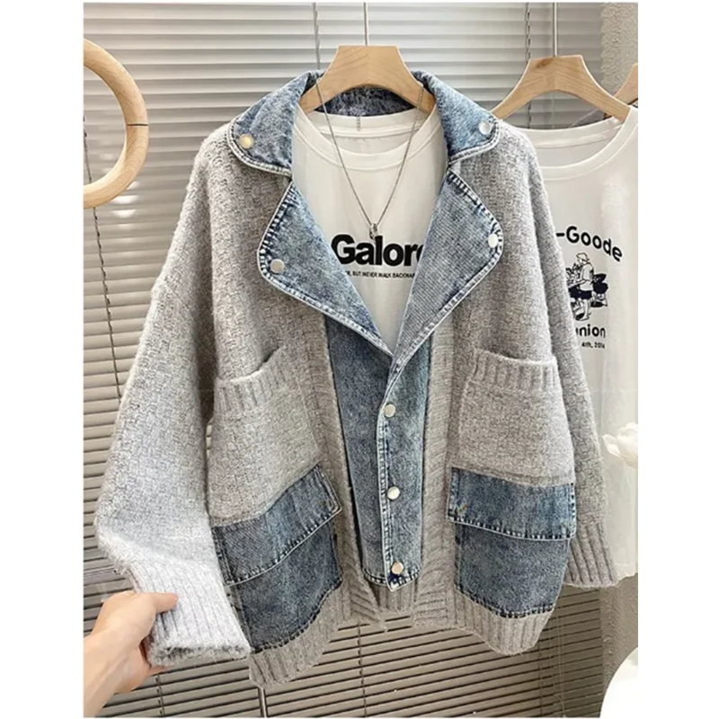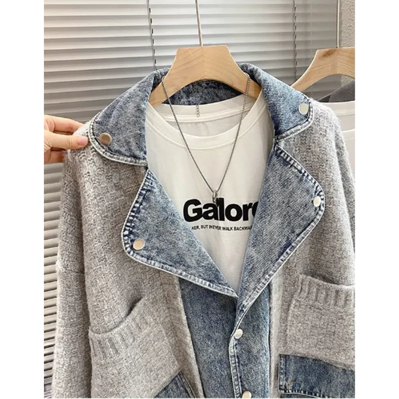 2024 Autumn Winter Retro Personality Stitching Denim Jacket Lazy Wind Knitted Sweater Cardigan Fashion Tide Comfortable Jacket