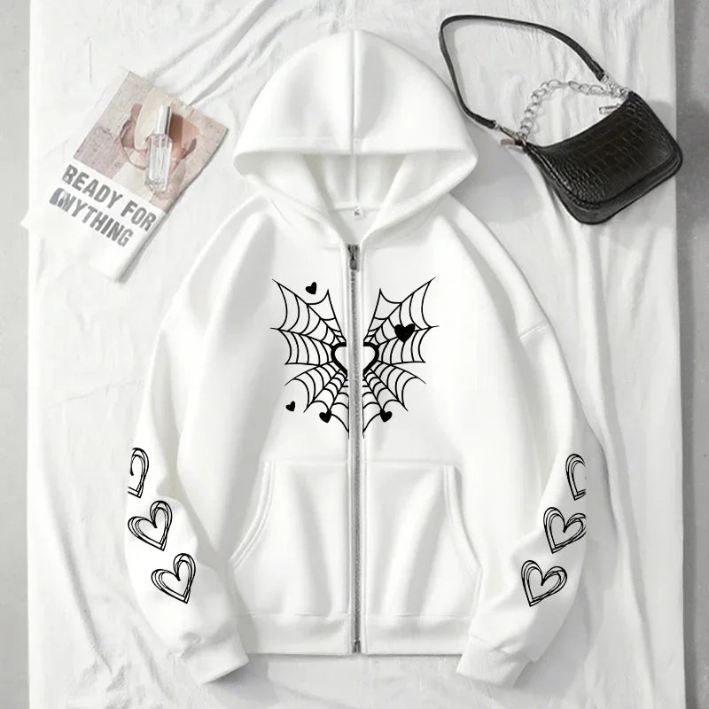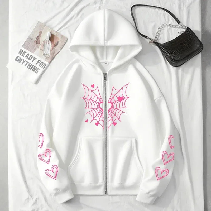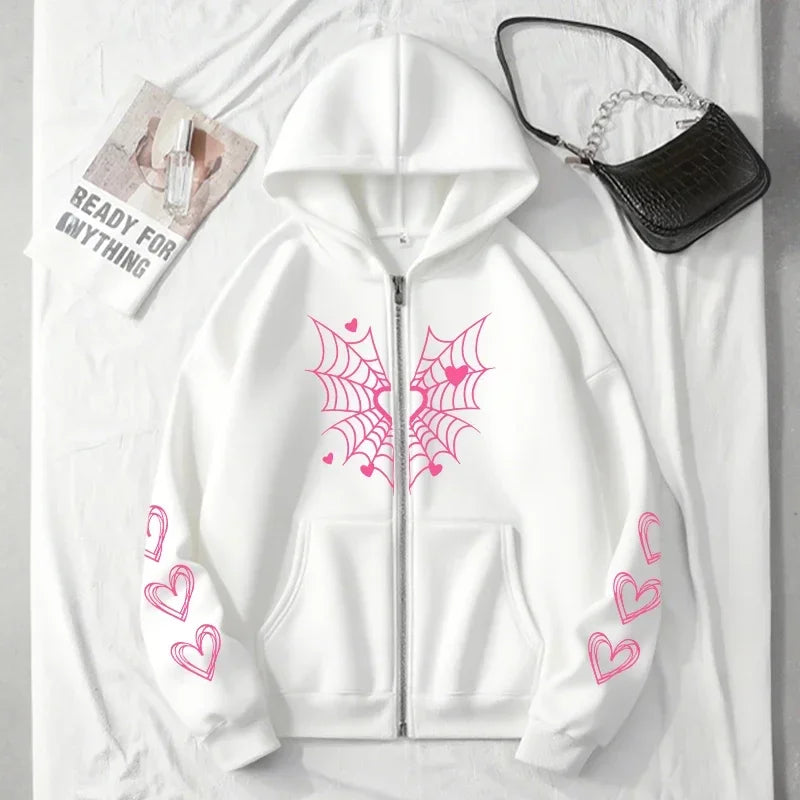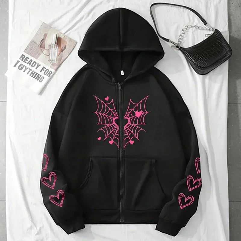 2025 Hot Sale Women's Hoodie Cute Spider Web Heart Print Zip-up Sweatshirt All Season Female Urban Casual Fashion Hooded Jackets