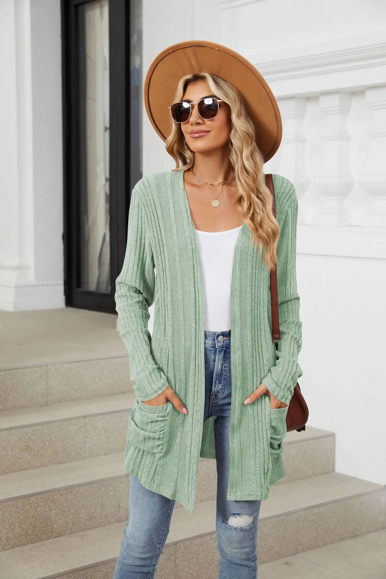 Autumn Winter New Solid Color Pit Stripe Brushed Pocket Cardigan Best Selle Long Sleeved Jacket for Woman Clothes