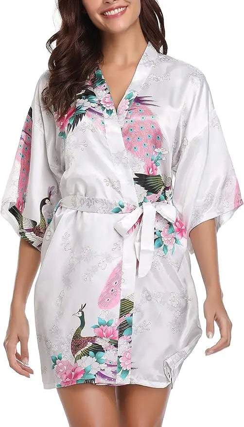 Womens Kimono Robes Dressing Gown Satin Bathrobe Nightdress Short Style Bridal Robe