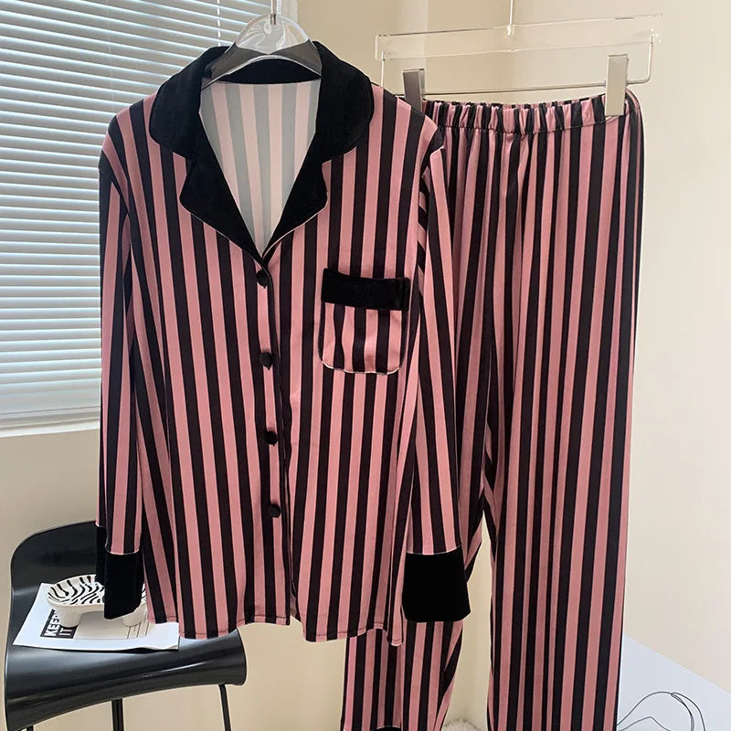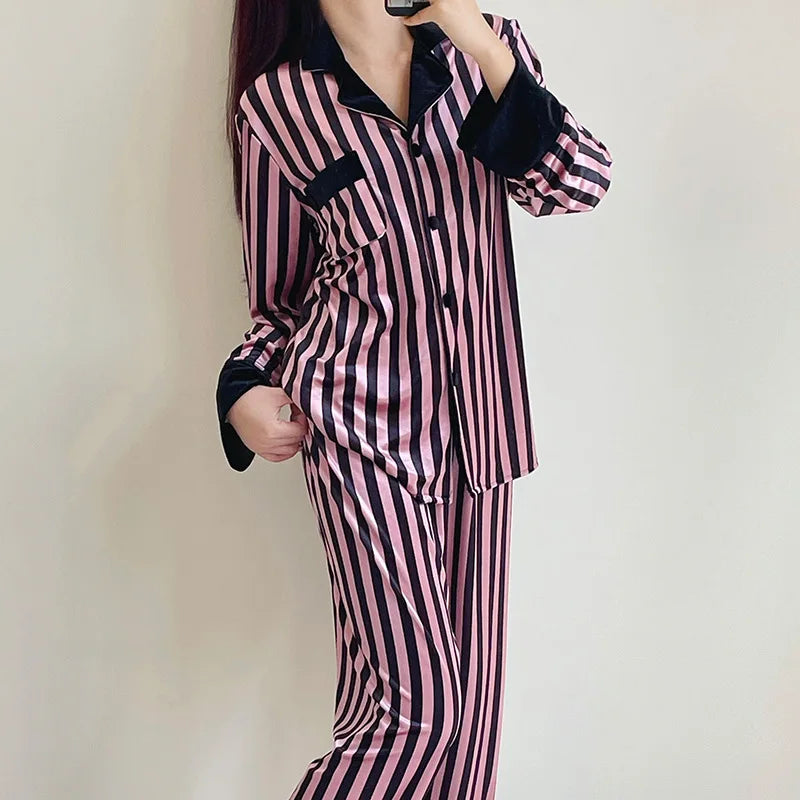 Autumn Winter Striped Pajamas Set for Women Sleepwear Long Sleeve Button Top and Long Pants Set Homewear Loungewear