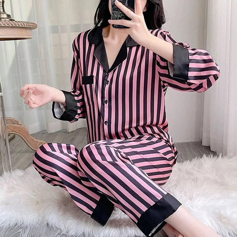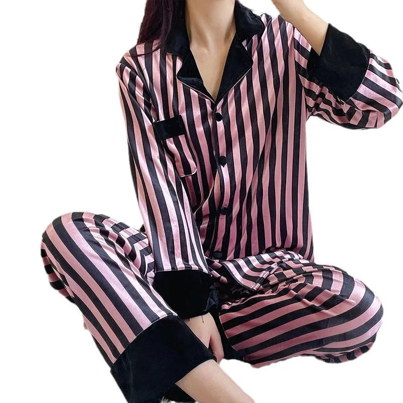Sexy Nightwear Women's Autumn Winter Long-Sleeved Fashion Senior Sense Temperament Ladies Homewear Suit Striped Cardigan Lapel