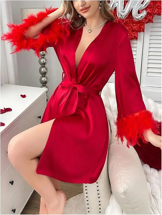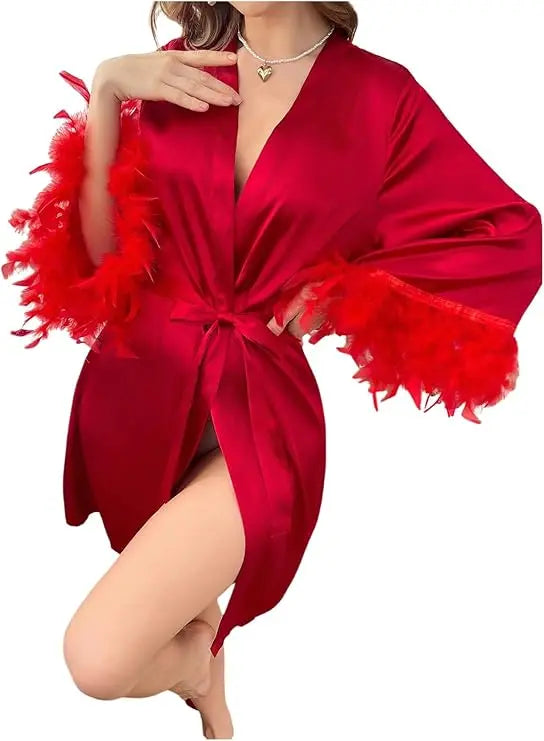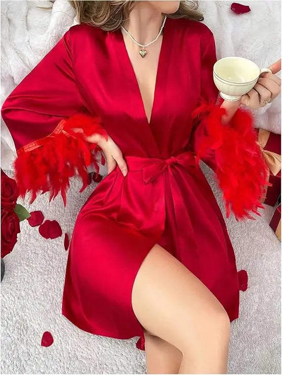 Burgundy Feather Wedding Robe Dress Bride Bridesmaid Morning Bathrobe Gown Sexy Women Sleepwear Nightgown Loose Satin Homewear