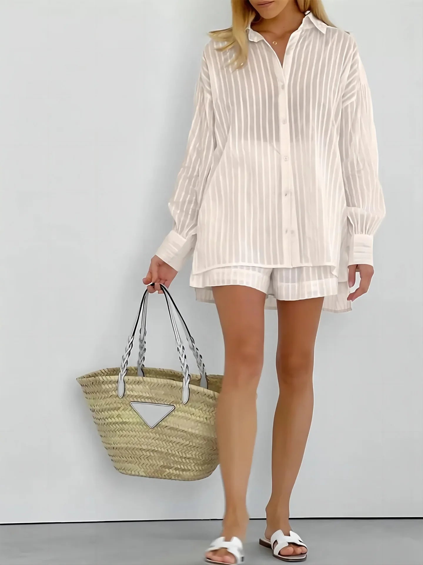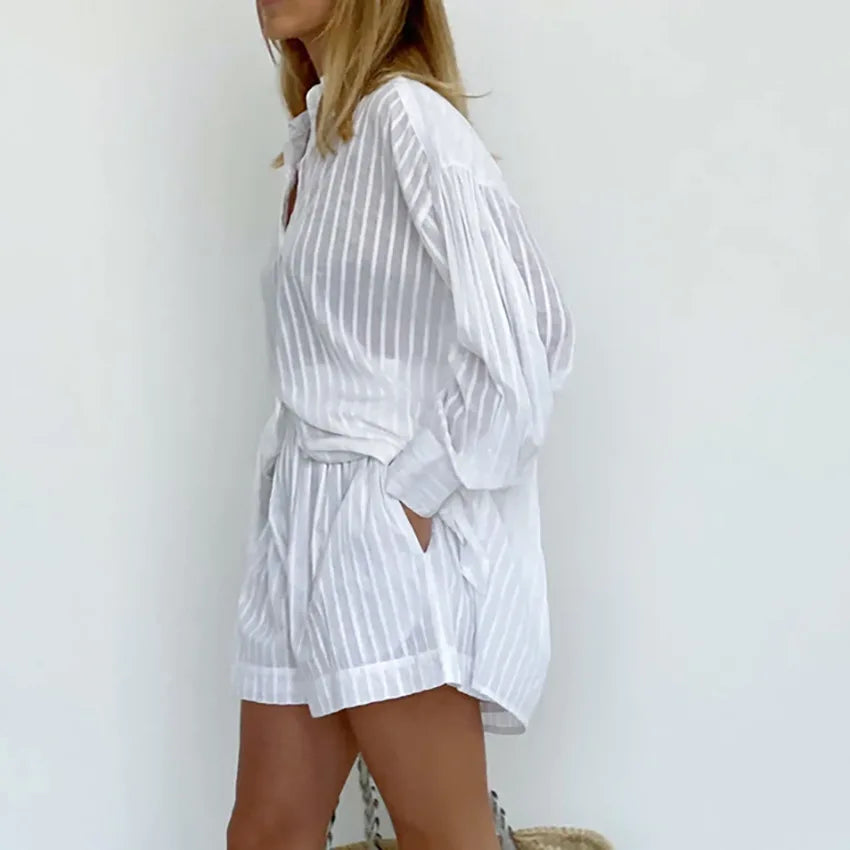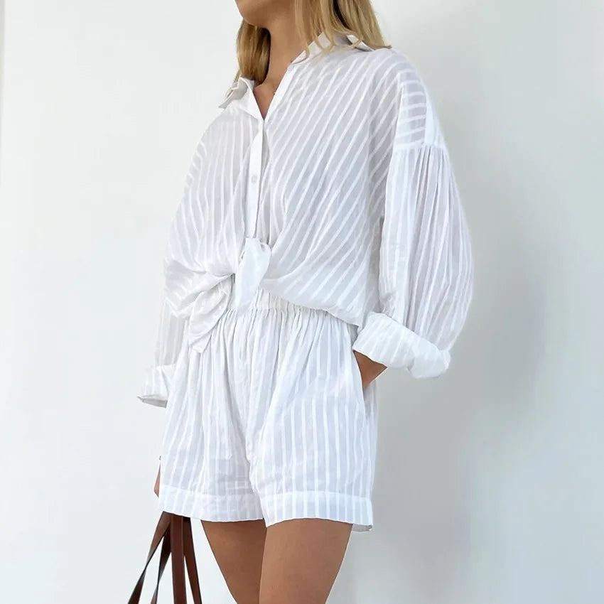 2024 Spring Summer Solid Cotton Short Two Piece Set Women Stripe Long Sleeve Shirts Shorts 2 Piece Sets Simple Style Lady Suit