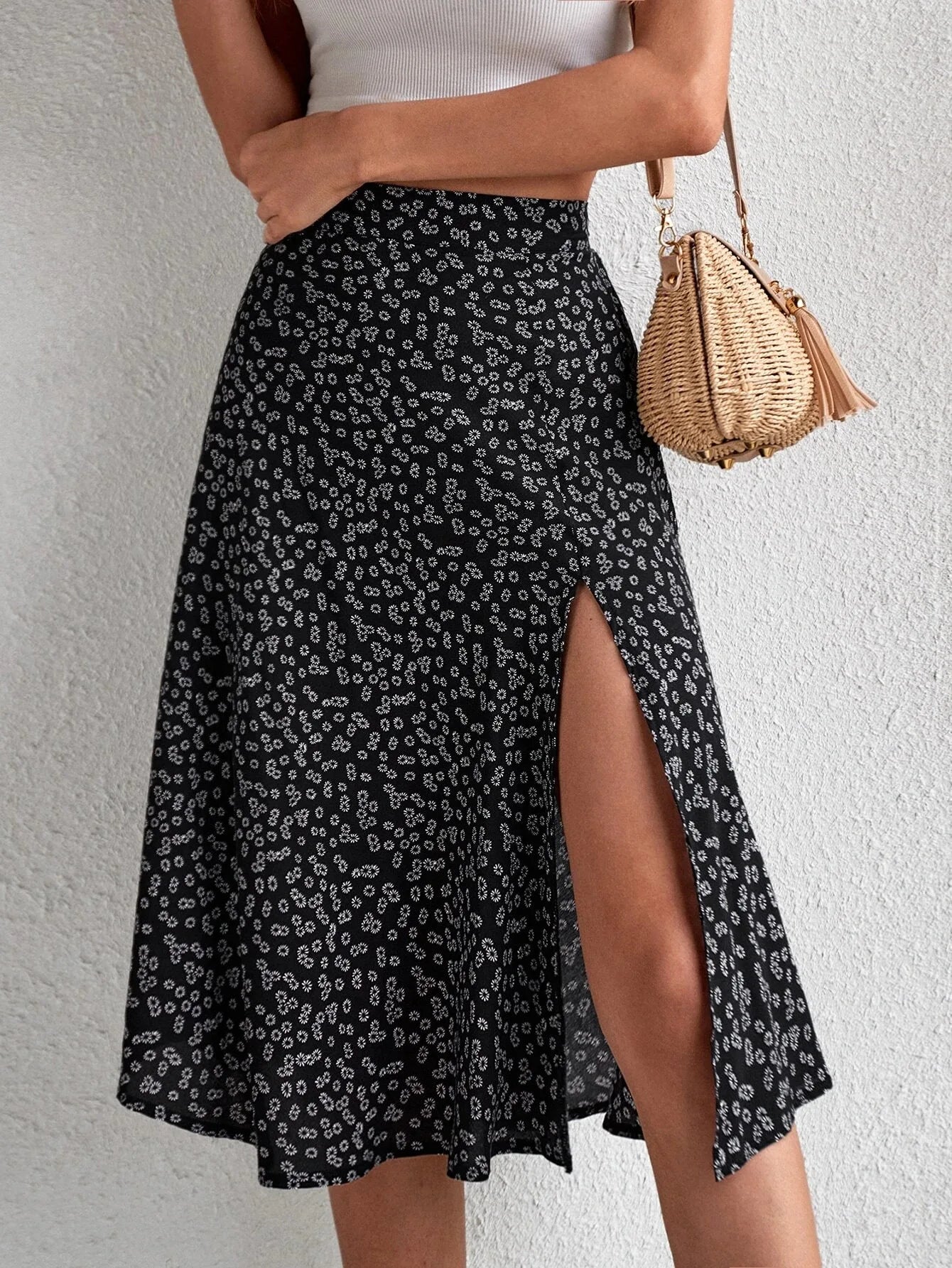 Spring and summer new women's versatile floral zipper split A-line skirt