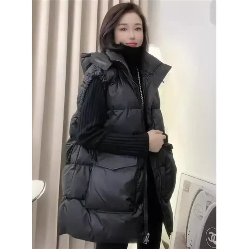 Autumn Winter Mid-Long Down Cotton Waistcoat Women 2025 New Fashion Loose Casual Hooded Vest Coat pure Colour Outerwear Female