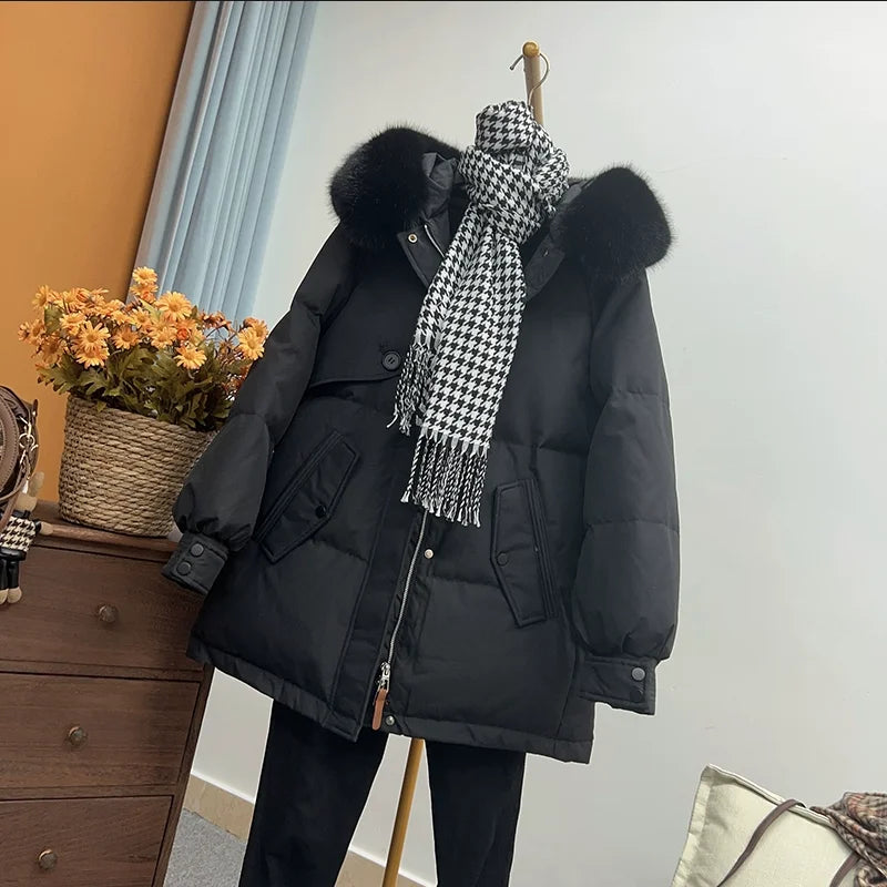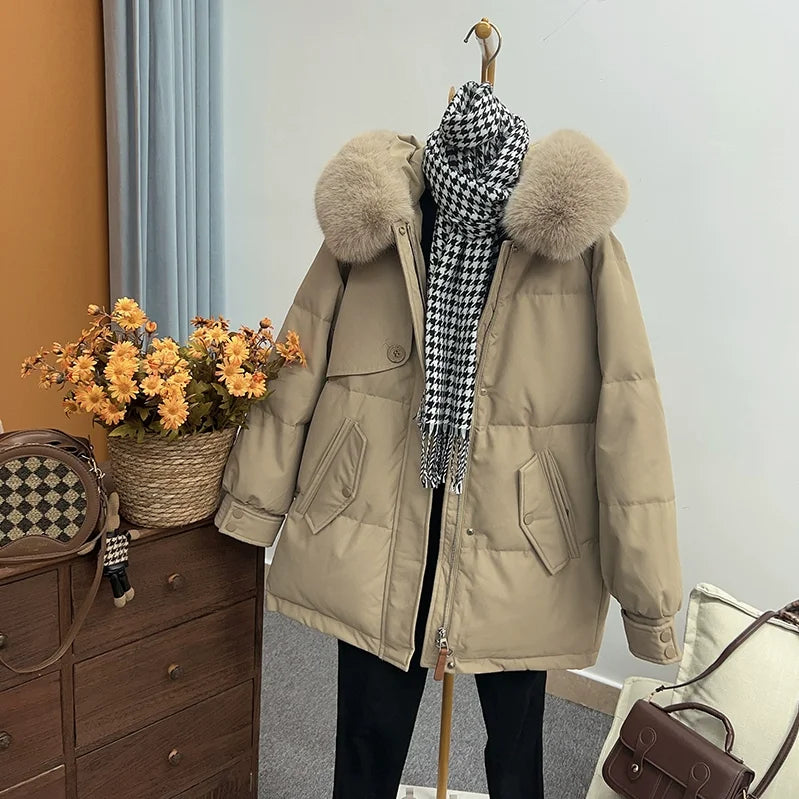 2025 Winter New Women's Down Jacket Loose Hooded Commuter Big Wool Collar Jacket