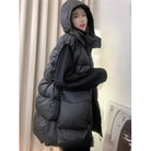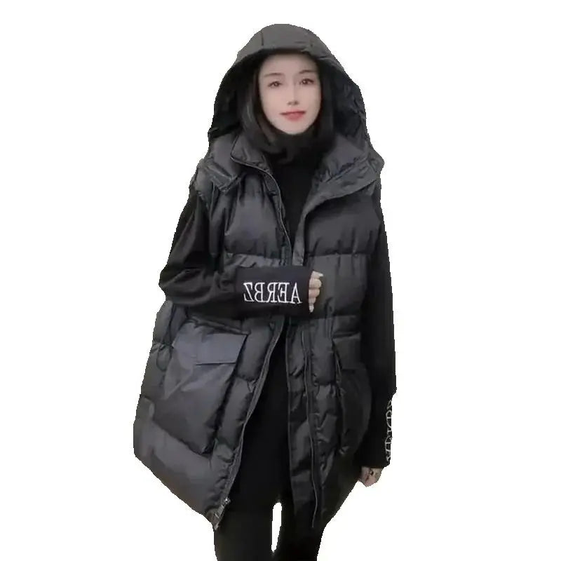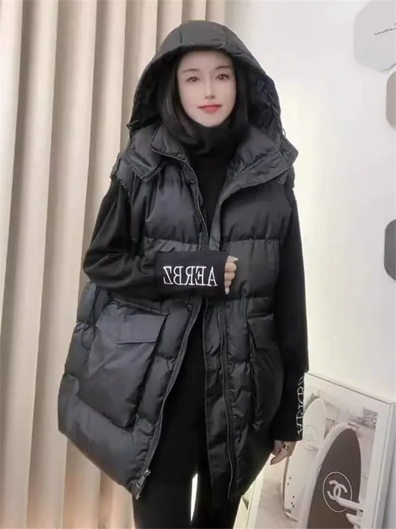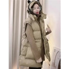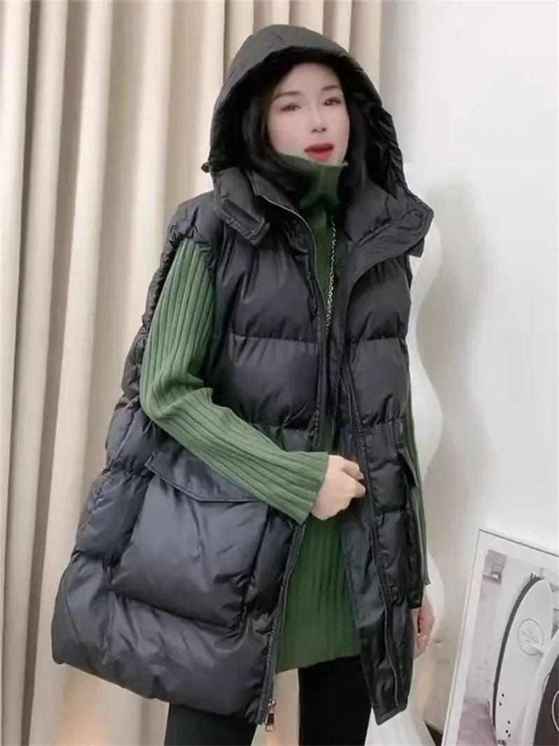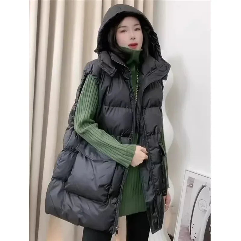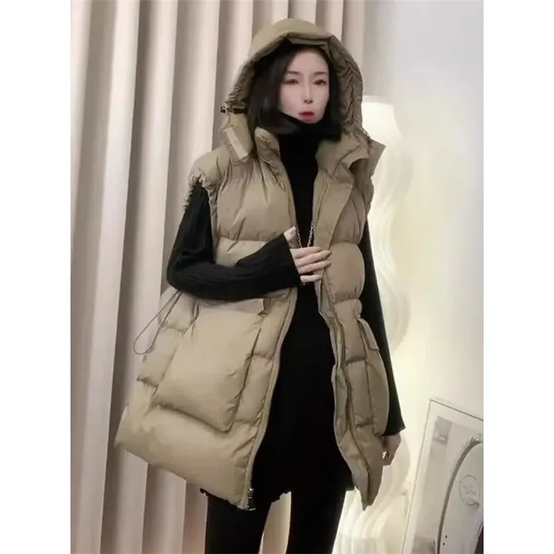 Autumn Winter Mid-Long Down Cotton Waistcoat Women 2025 New Fashion Loose Casual Hooded Vest Coat pure Colour Outerwear Female