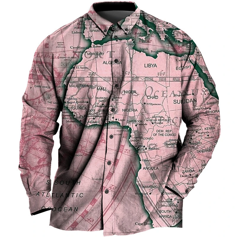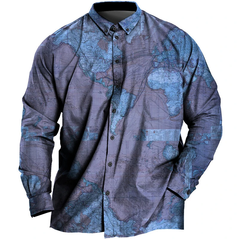 Men's Daily Casual Vintage World Map 3D Printed Shirt Long Sleeve Street Classic Cool Retro Design Blouses Clothing Lapel 2024