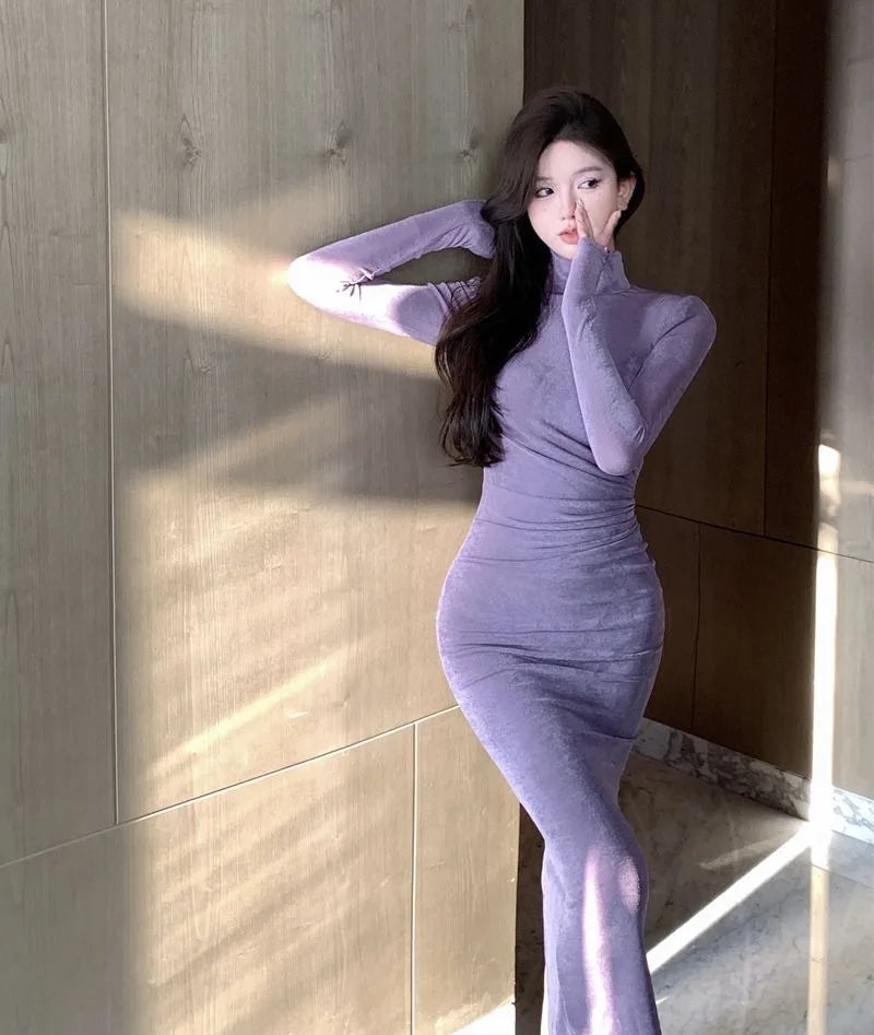 Violet High Collar Long Sleeve Women's Dress Autumn Winter Elegant Sexy Mid-Length Base Layer Wrap around Skirt