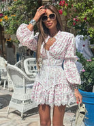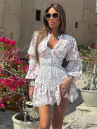 V-Neck Printed Lace Mini Dresses Female Ruffled Fashion High Waist Slim Bandage Summer Short Luxury Party Women's Mini Dress