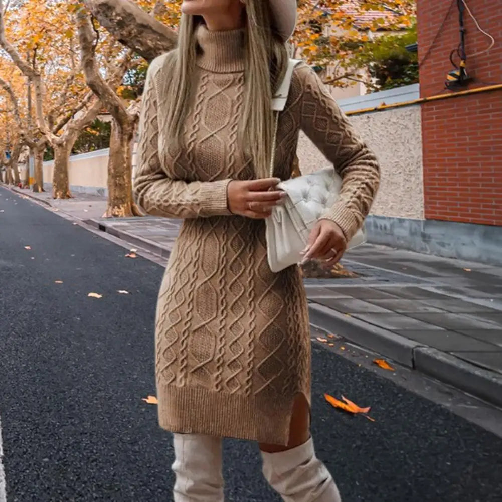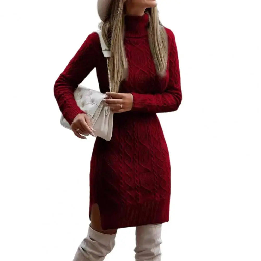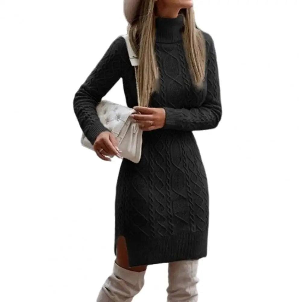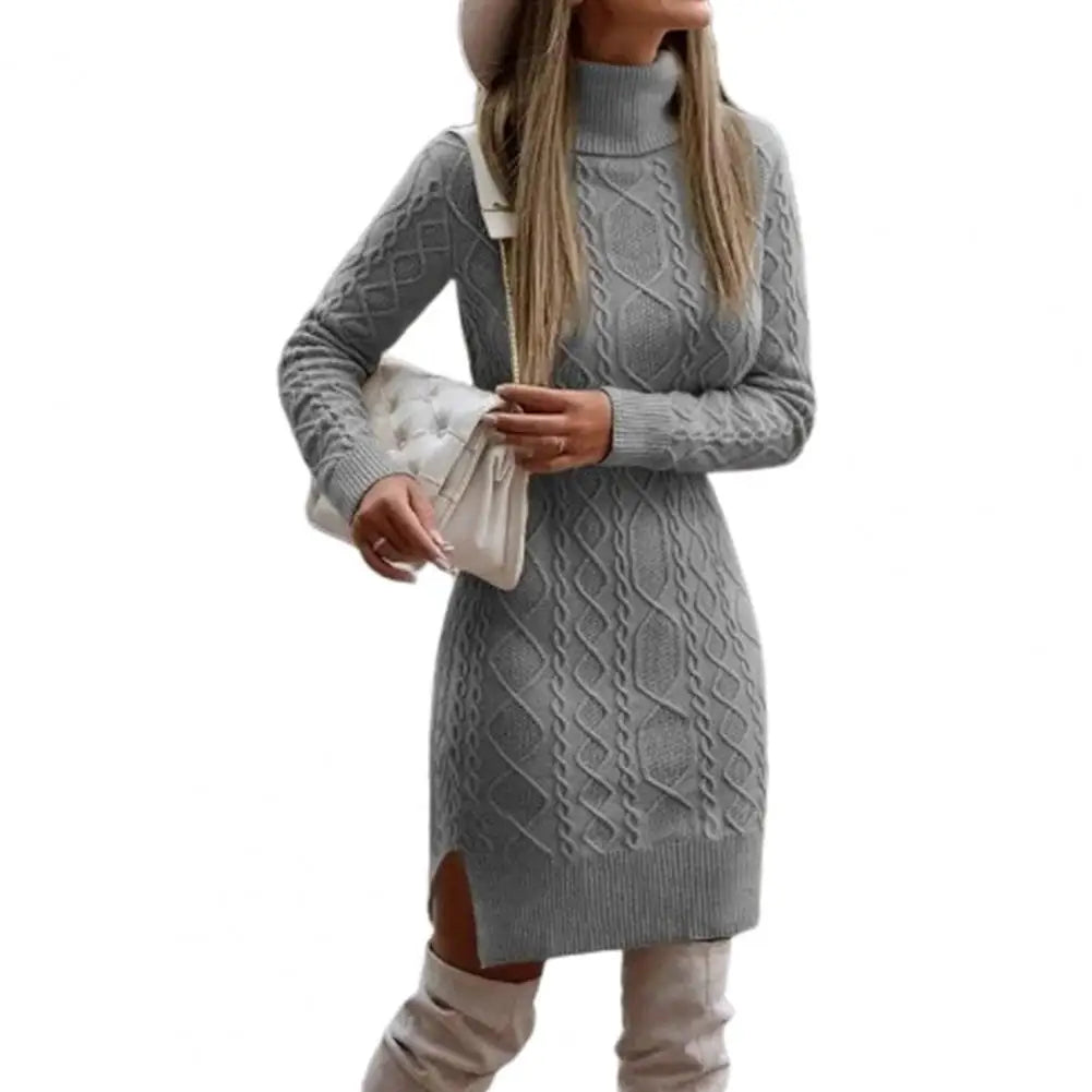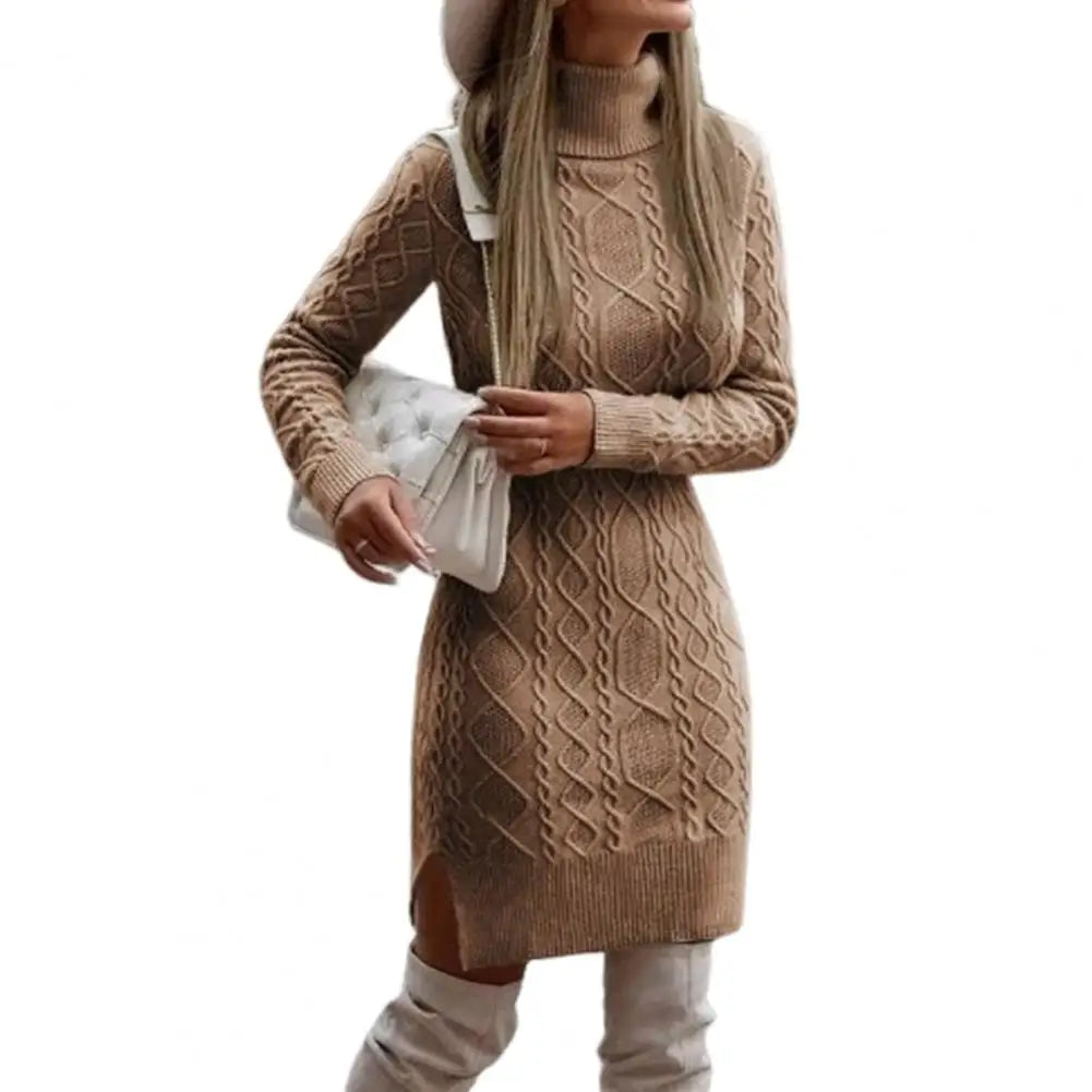 Women's Autumn Winter Fashion High Neck Knitted Sweater Dress Female Casual Solid Loose Long Sleeve Warm Mid Length Dresses