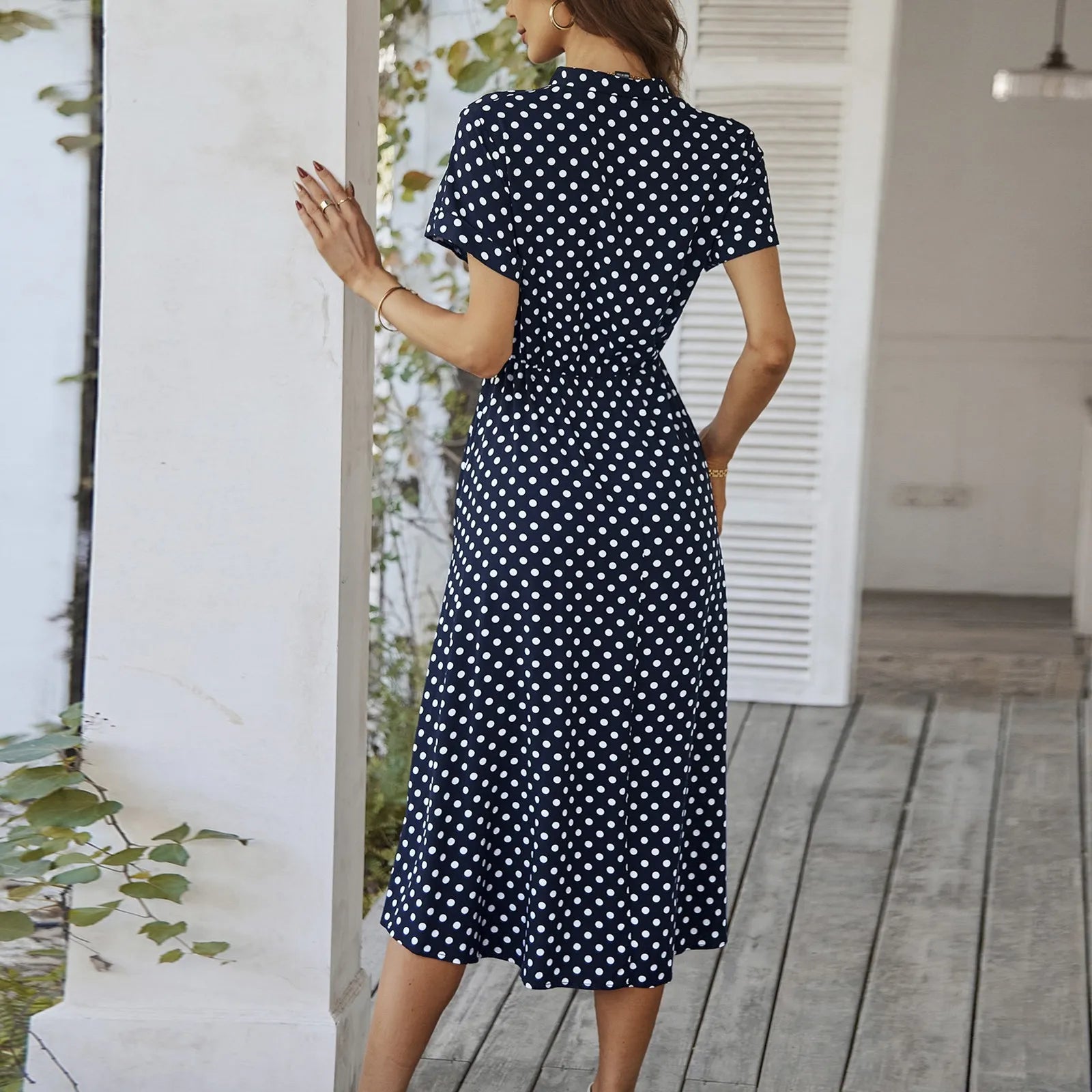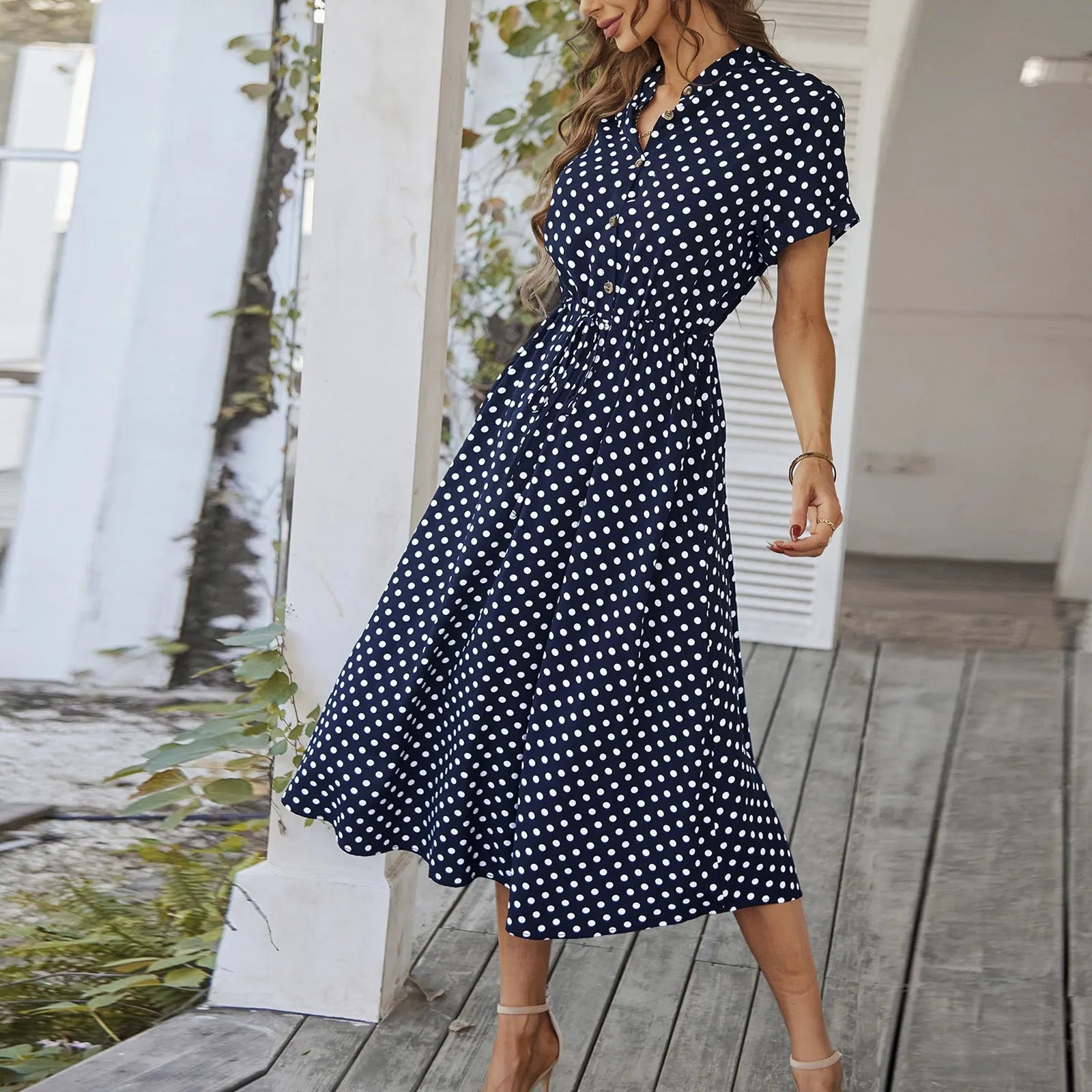 Elegant retro polka dot dress Women's Summer Midi Dress V Neck Single Breasted Short Sleeve Dresses Fashion Print Dress