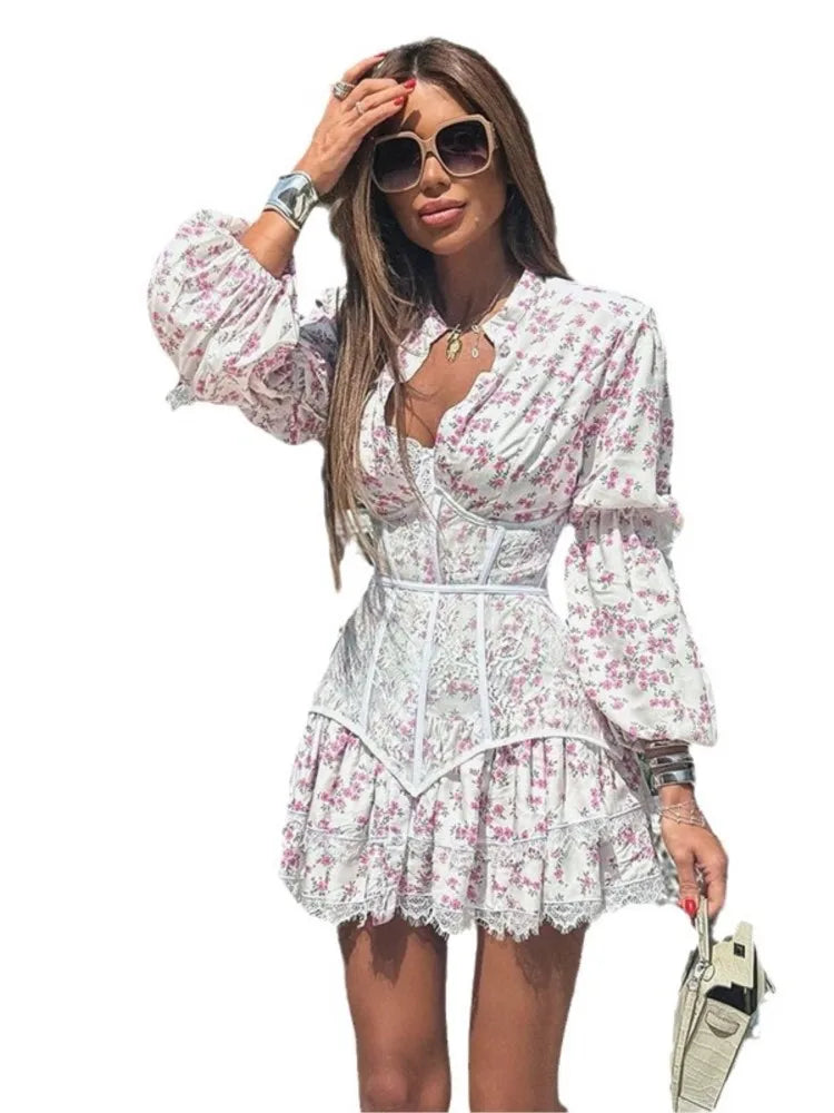 V-Neck Printed Lace Mini Dresses Female Ruffled Fashion High Waist Slim Bandage Summer Short Luxury Party Women's Mini Dress