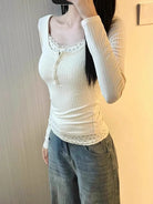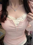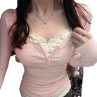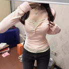Pink Sweet Anti-Aging Sexy Big Collar Floral Lace Fake Two-Piece Long Sleeve Women's Autumn Trendy Spicy Girl Top
