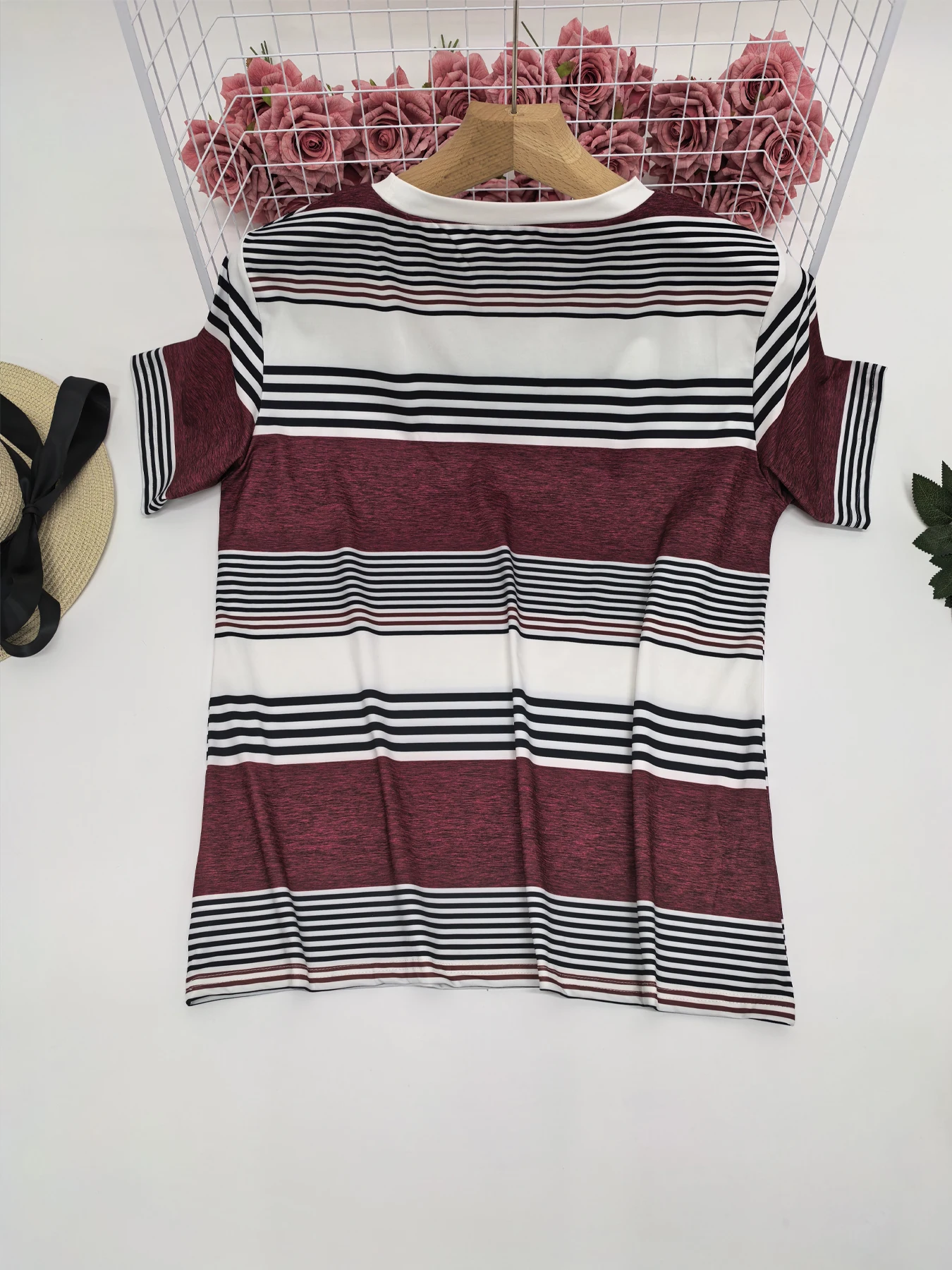 plus size women's elegant short-sleeved top striped casual round neck T-shirt with fake buttons suitable for spring