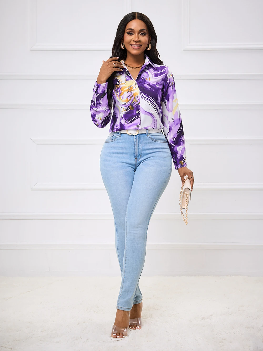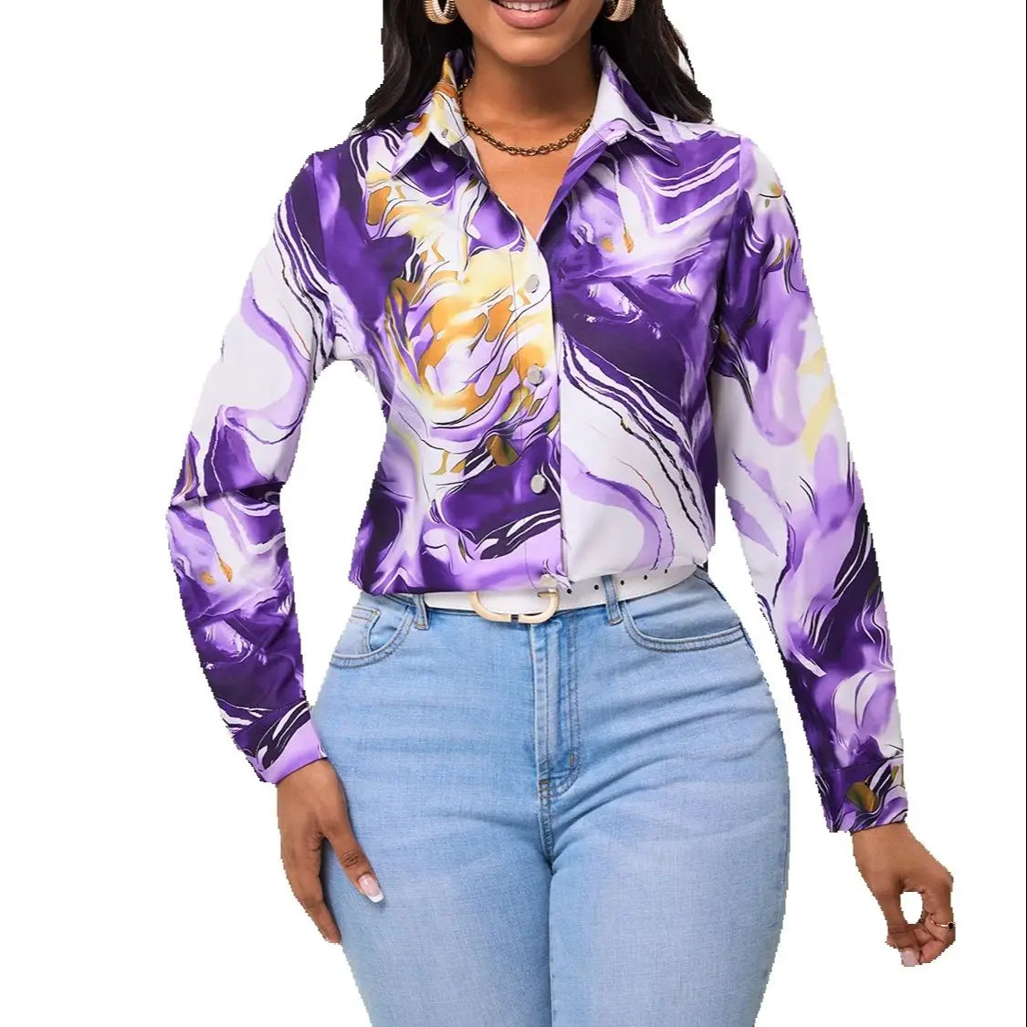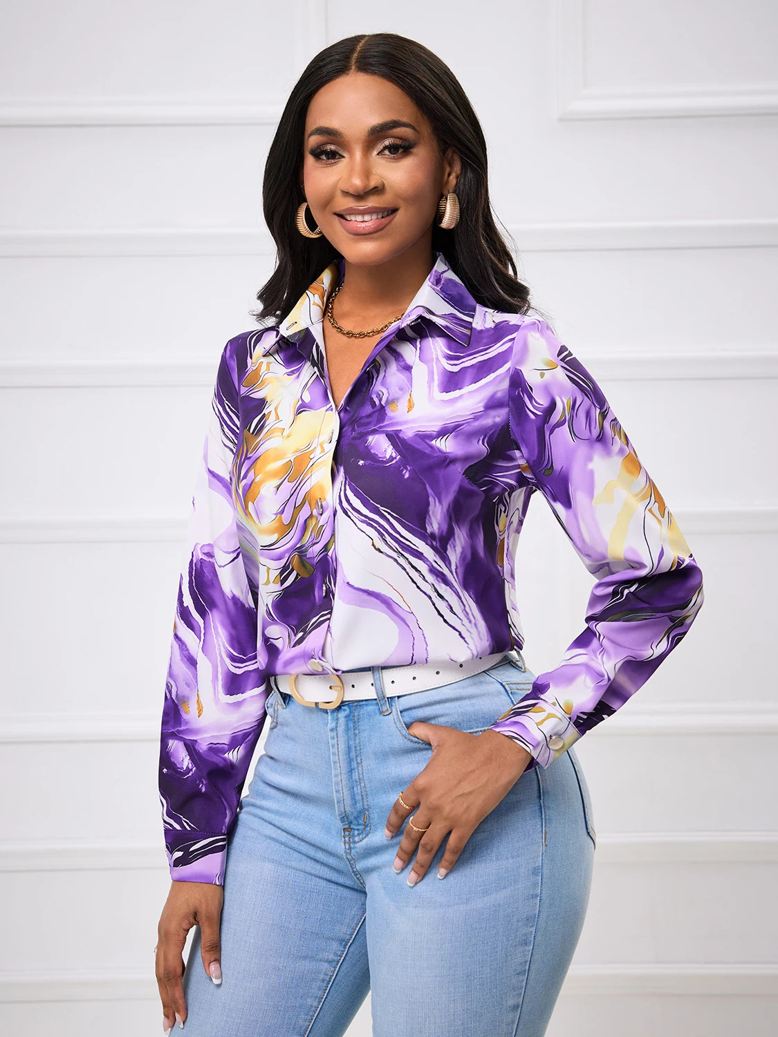 Women's Blouse Spring Summer Purple Gold Marble Print Collar Front Button Long Sleeve Satin Luxury Elegant Daily Office Top
