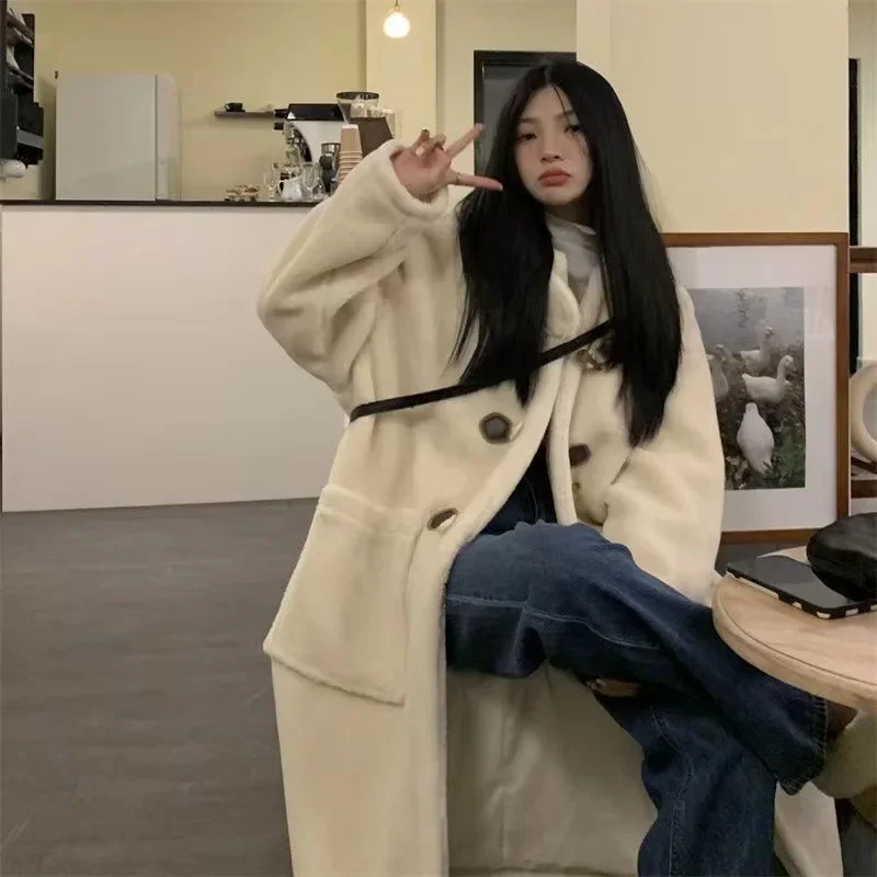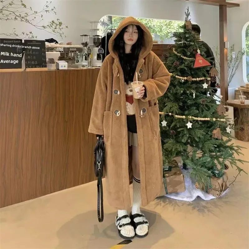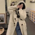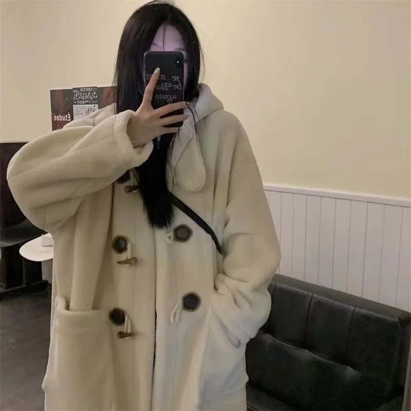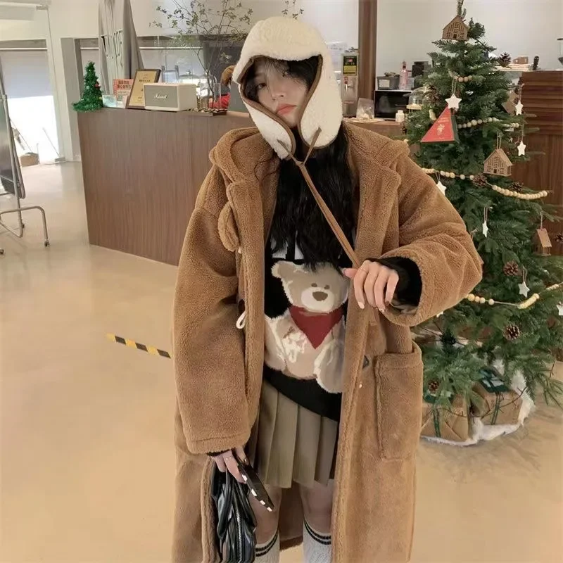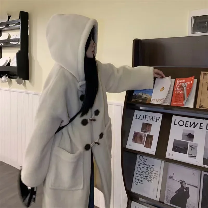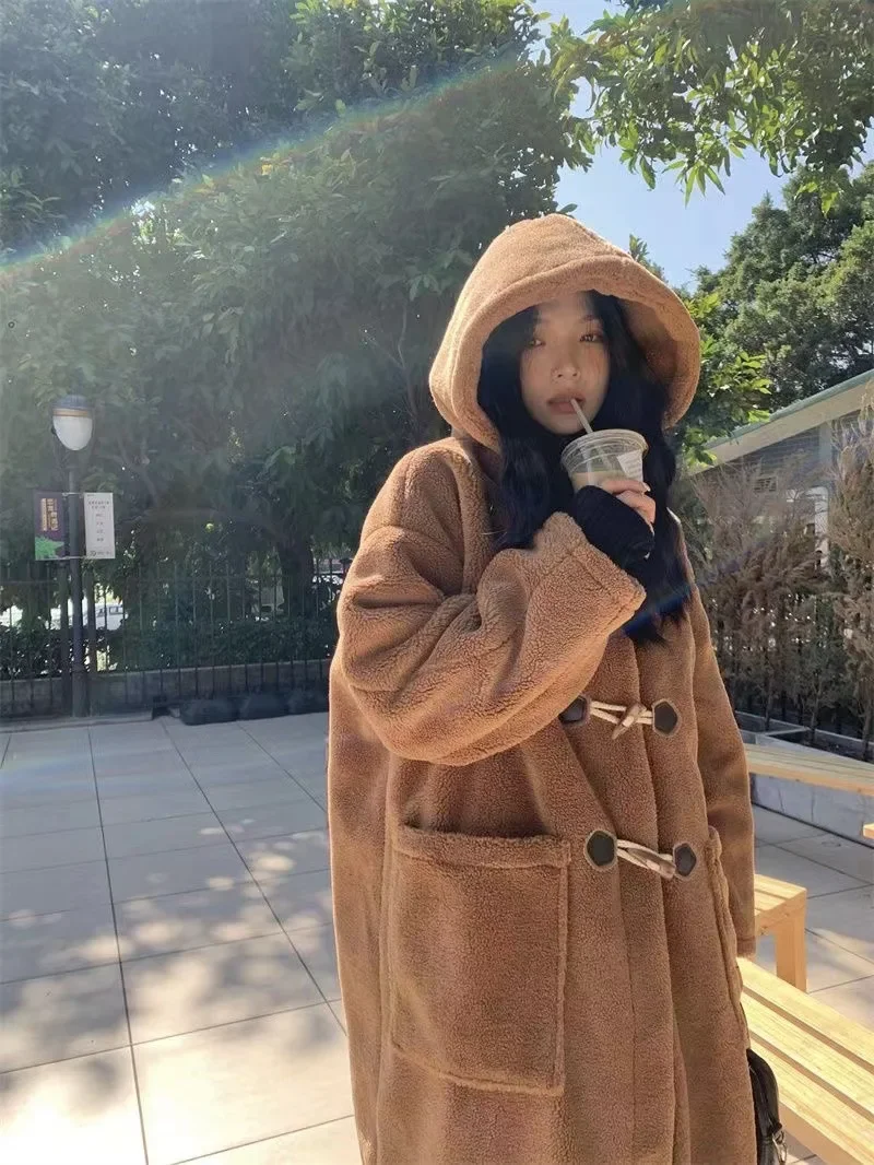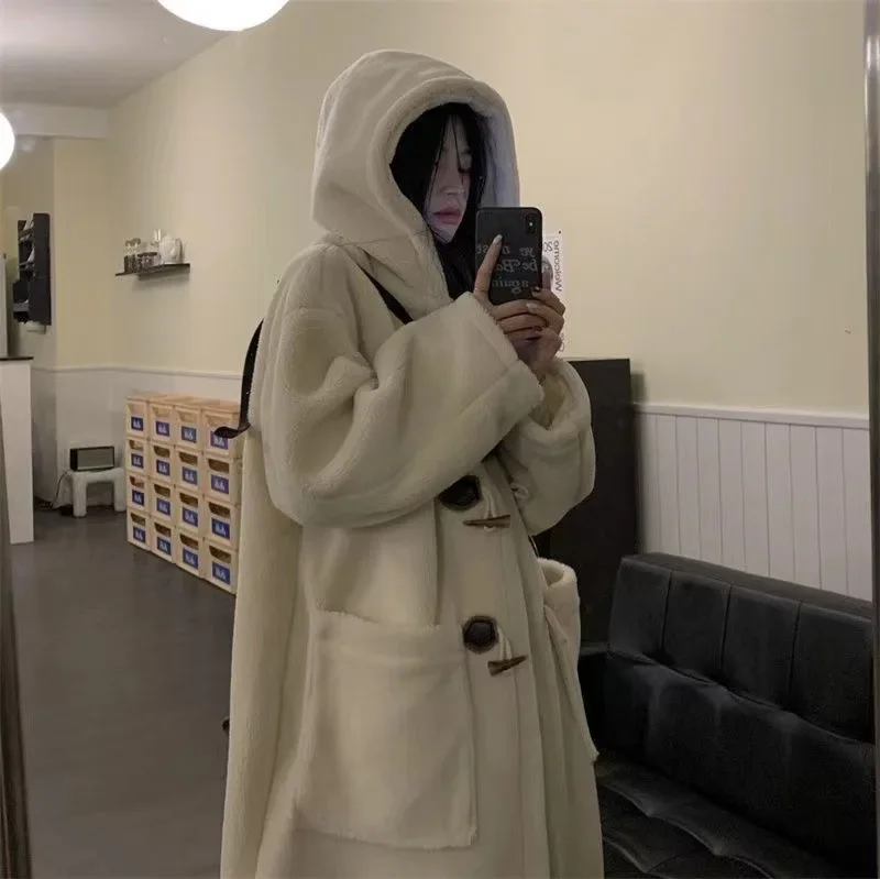 Long Lamb Fur Jacket Women's Autumn Winter Warm Hooded Coat Button Design College Style Large Coat Female Outerwear Coat