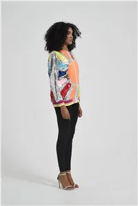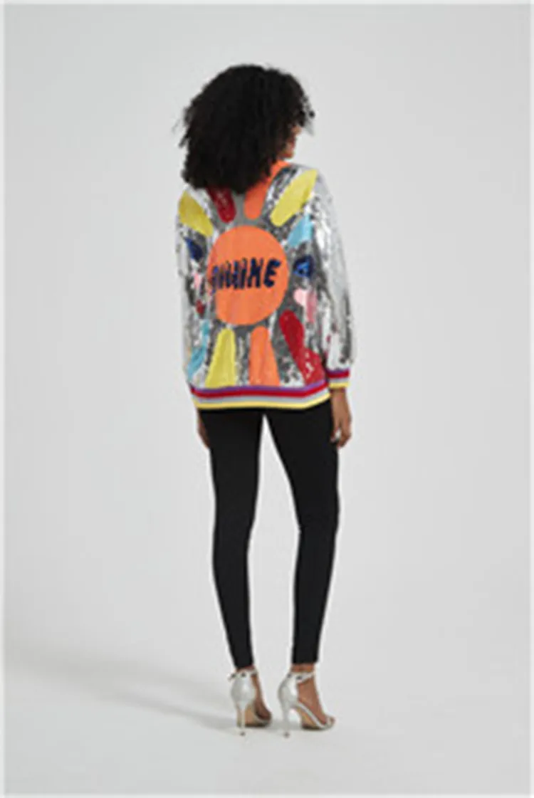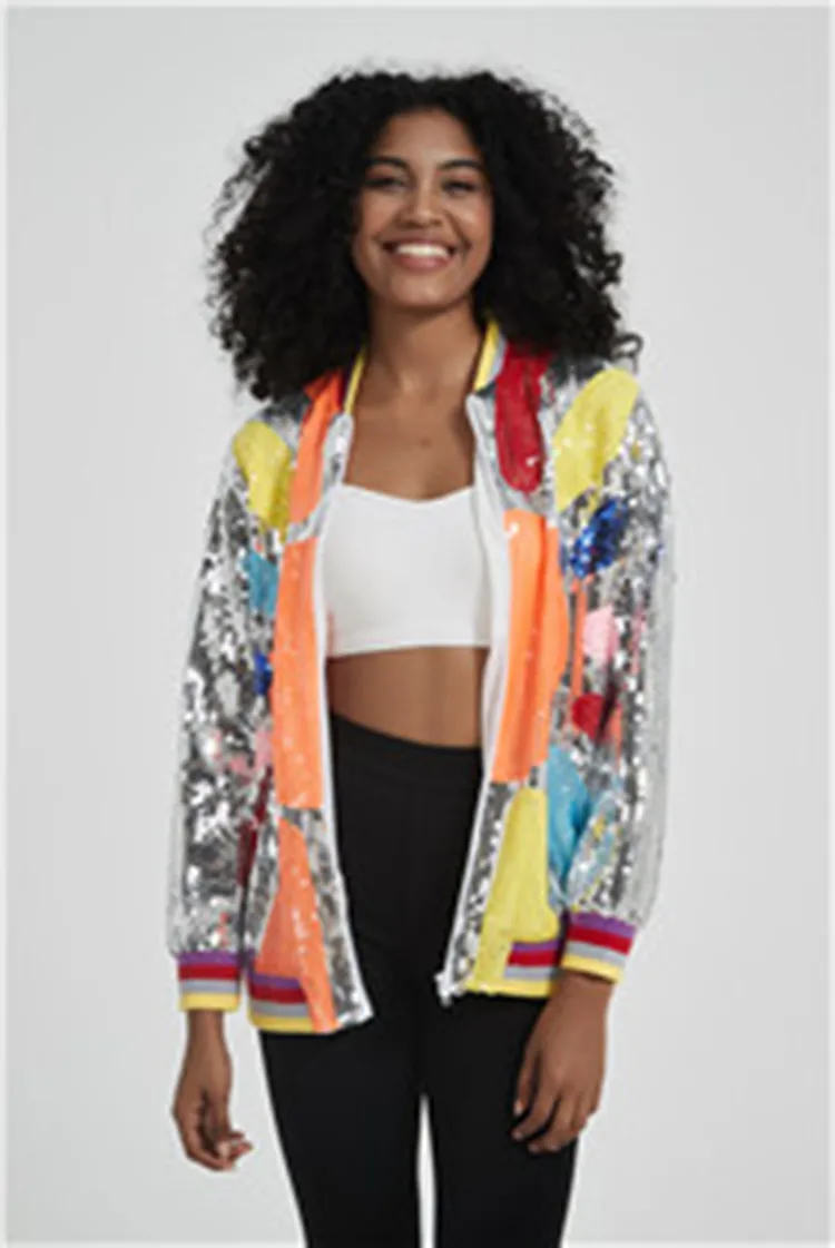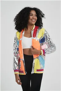 Spring And Autumn New Contrasting Color Patchwork Sequins Coats Loose Long Sleeve Streetwear Zipper Hip Hop Women Jackets
