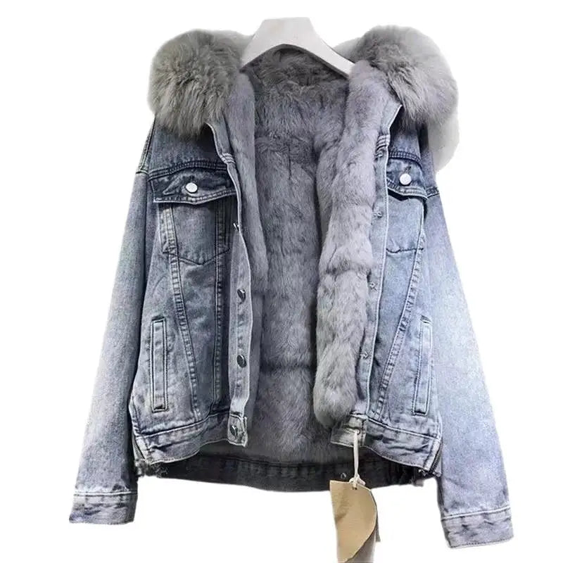 Thickened Fleece Lined Cotton Jacket Hot Sale Of The Season Winter New Style Loose Korean Version Denim Fur Collar Women Shor...