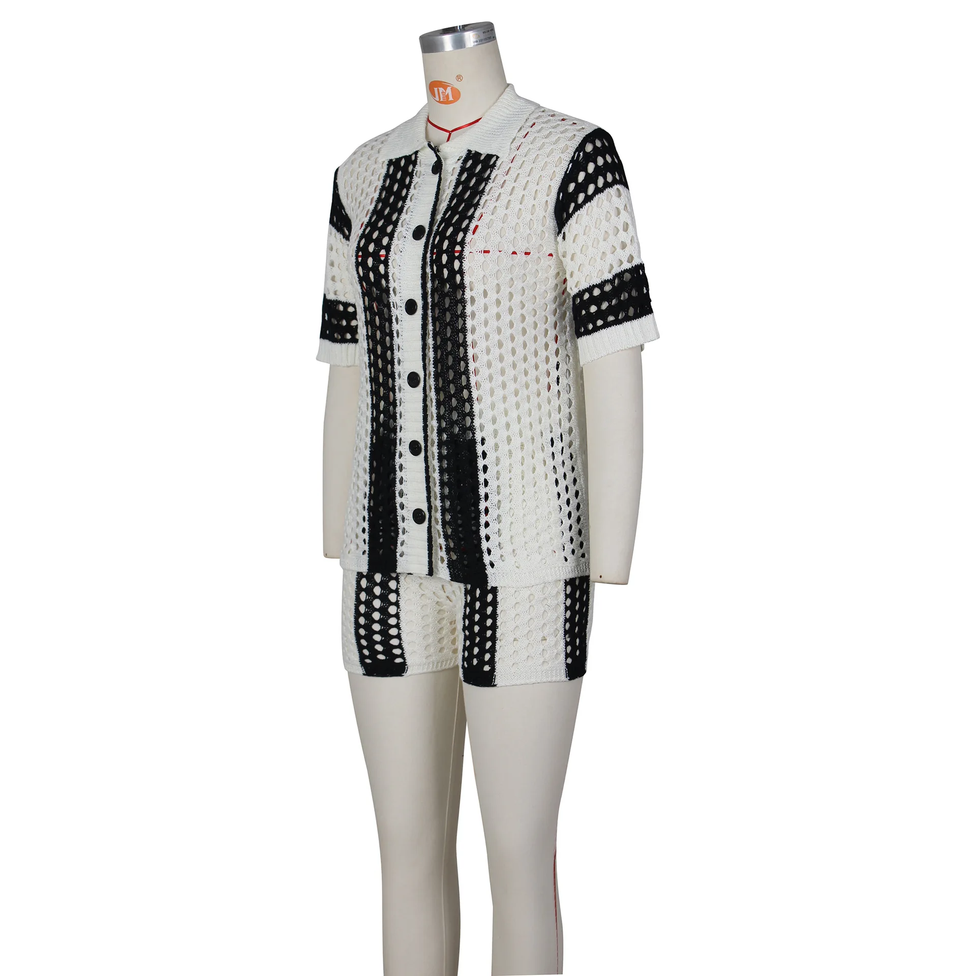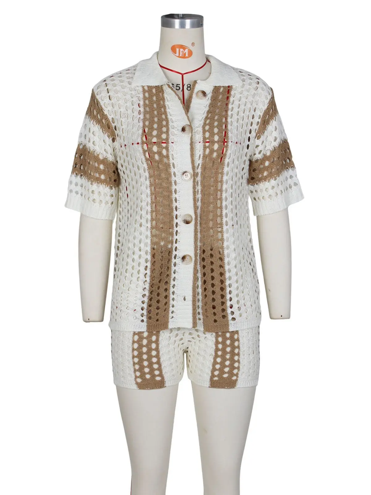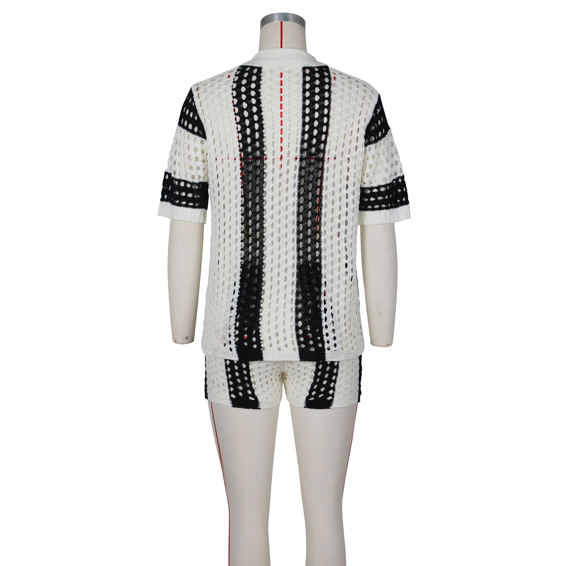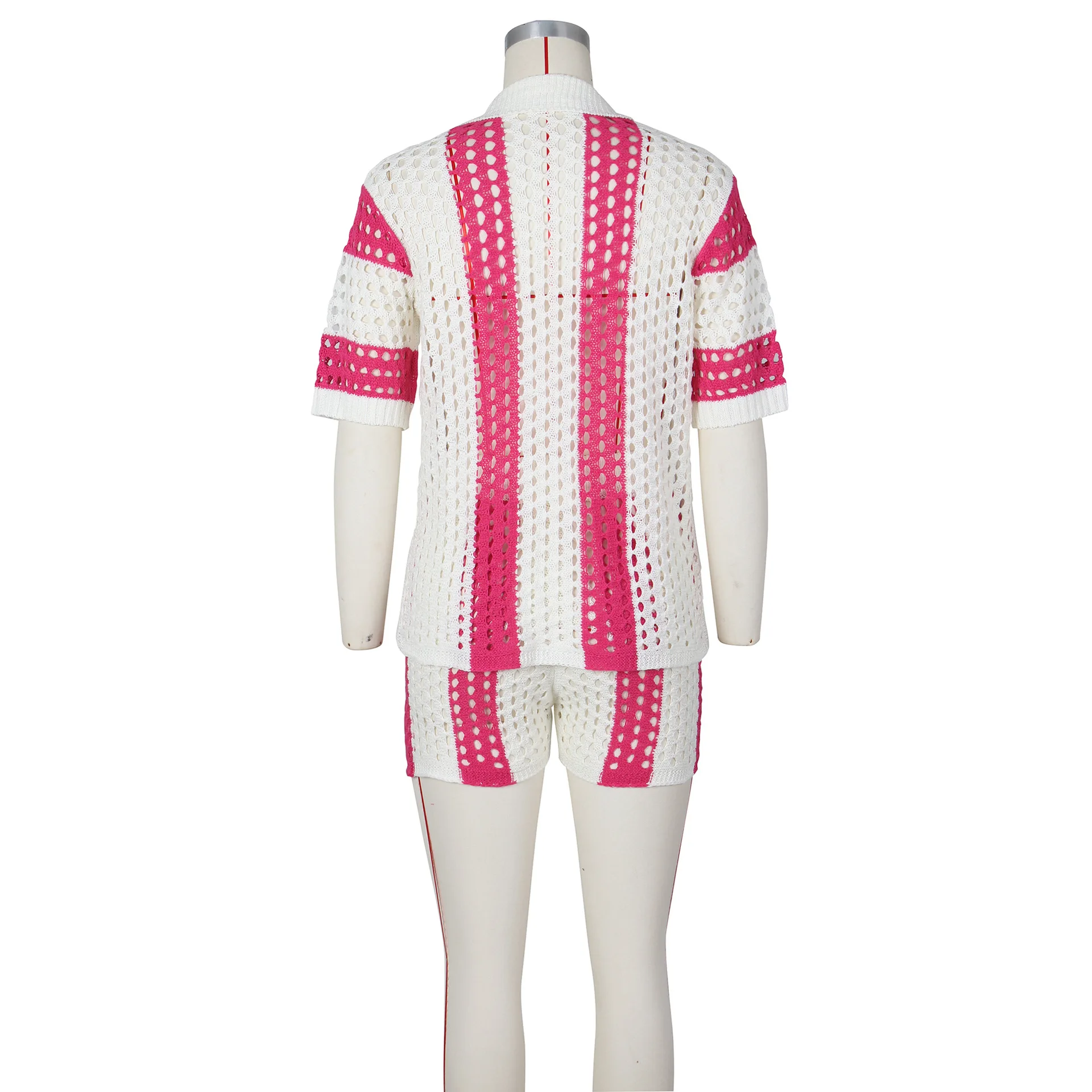 Striped Knitted Summer Shorts Sets for Women 2PCS Sets Holiday Hollow Out Button Up Top and Shorts Beach Wear Vacation Outfits