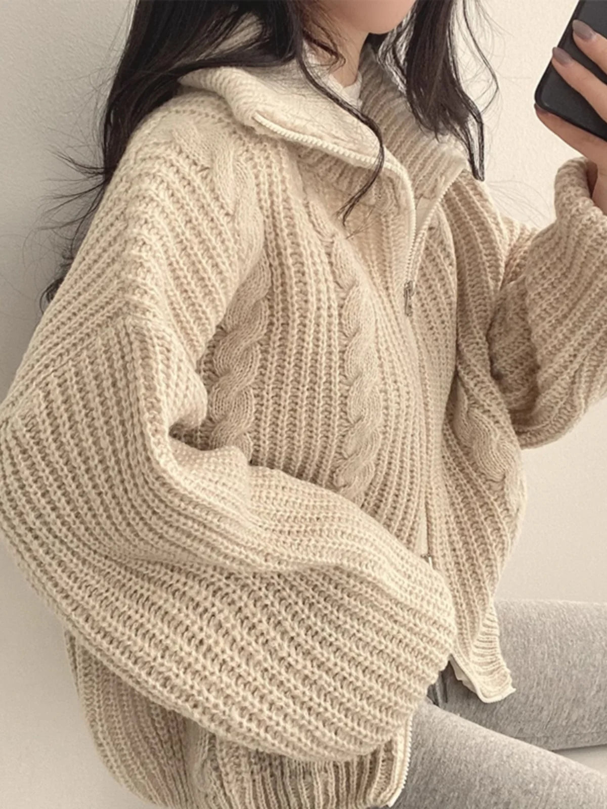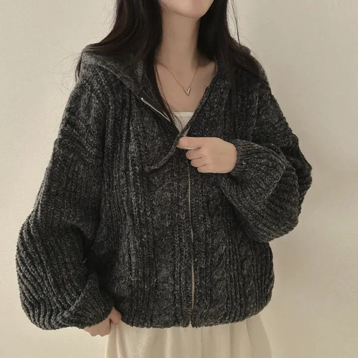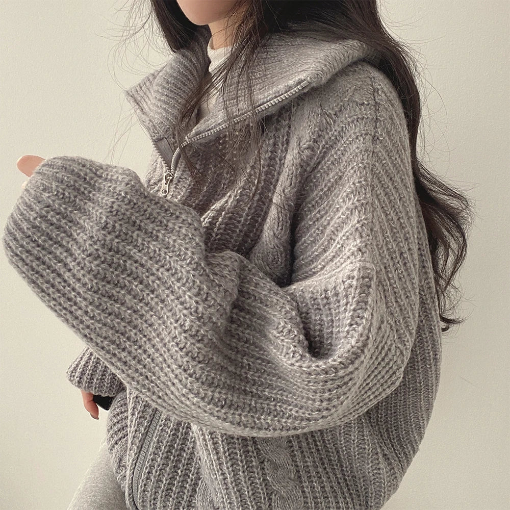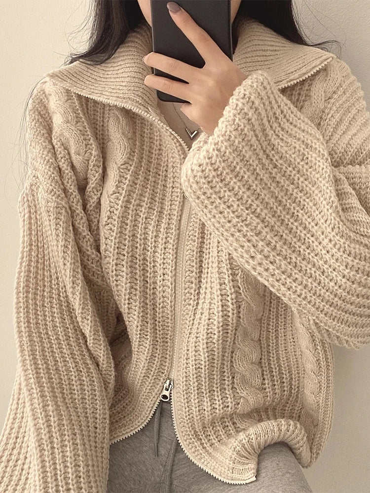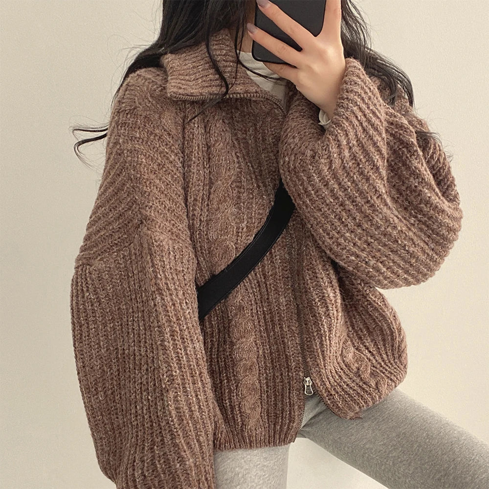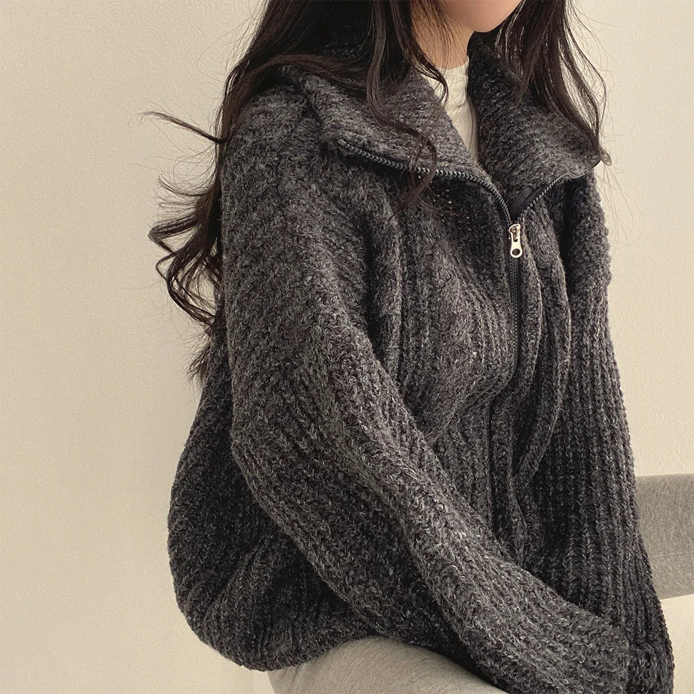 Retro Solid Double Zipper Turn-down Collar Sweater Women Autumn Winter New Lazy Style Loose Knitted Cardigan Thicken Loose Tops