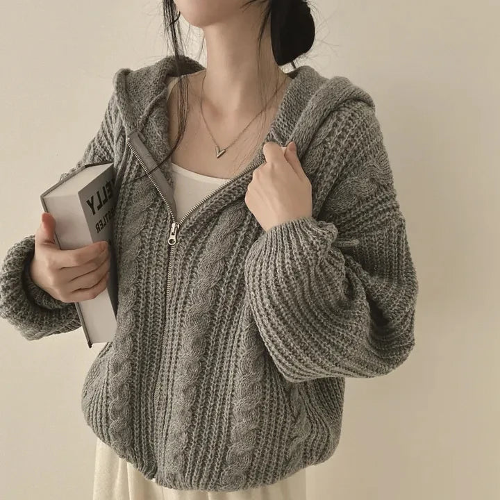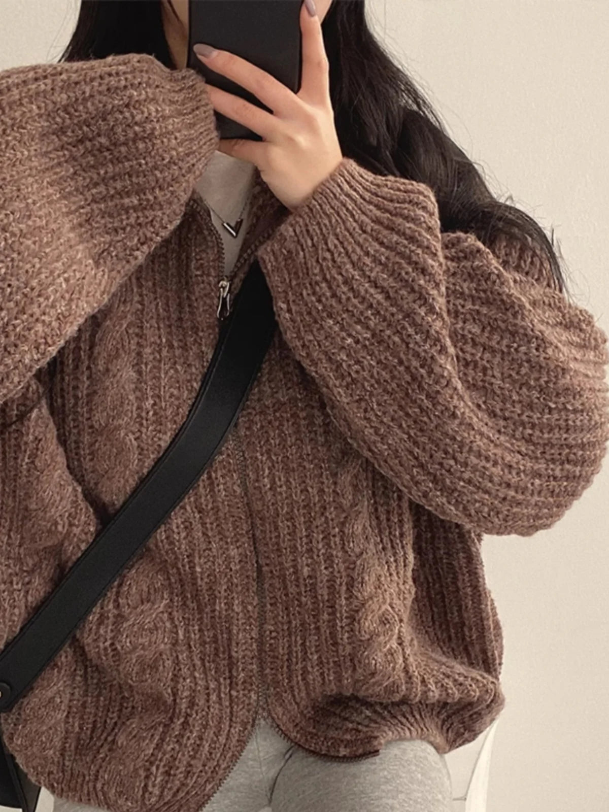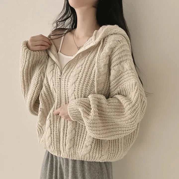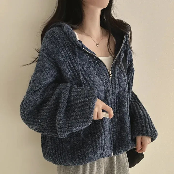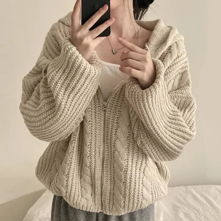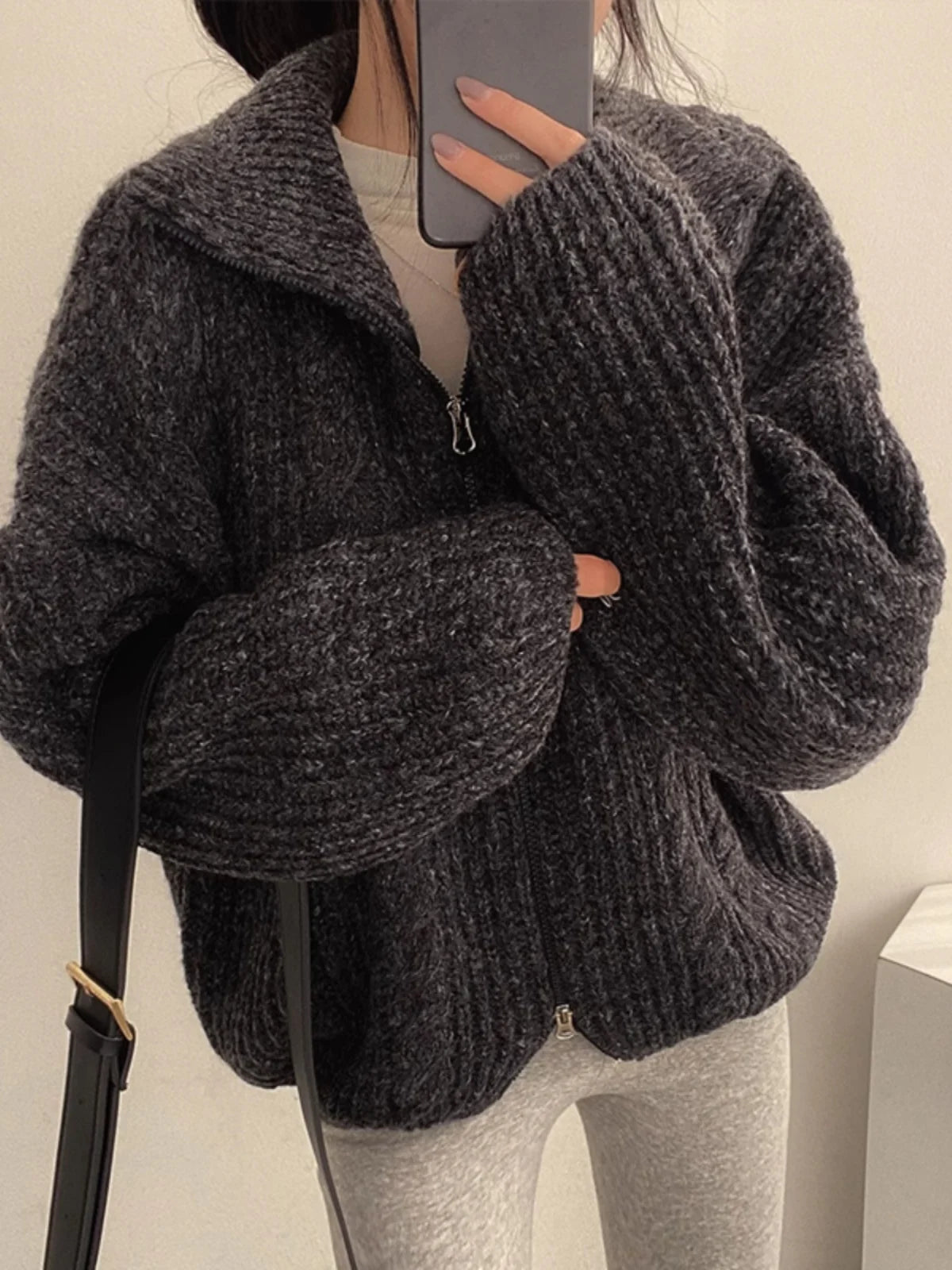 Retro Solid Double Zipper Turn-down Collar Sweater Women Autumn Winter New Lazy Style Loose Knitted Cardigan Thicken Loose Tops