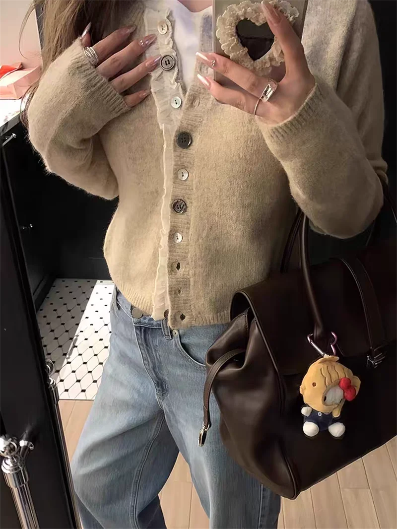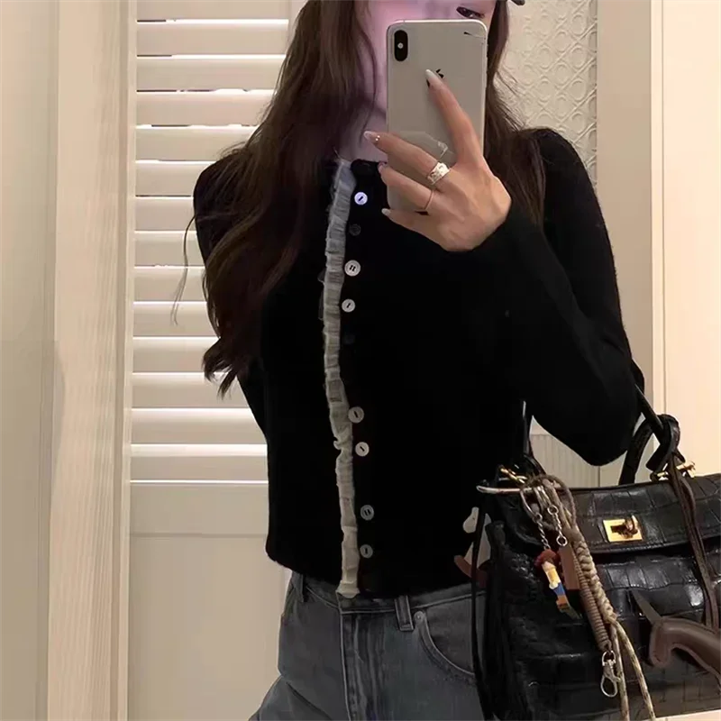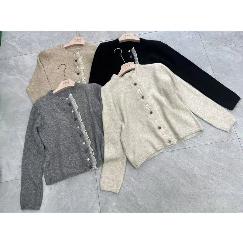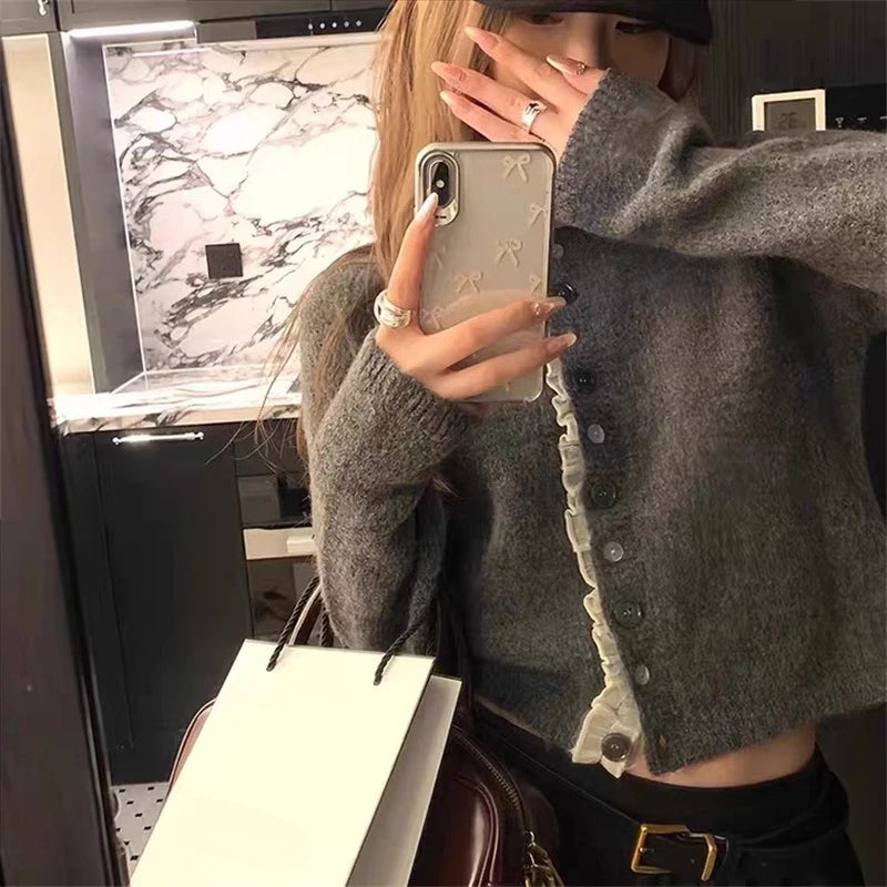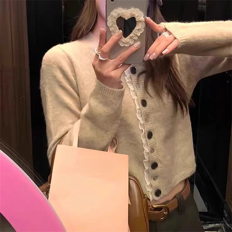 New Korean Style Lace Ruffles Soft Long Sleeve Elegant Button Knitted Top Casual Short Women Cardigan Sweater