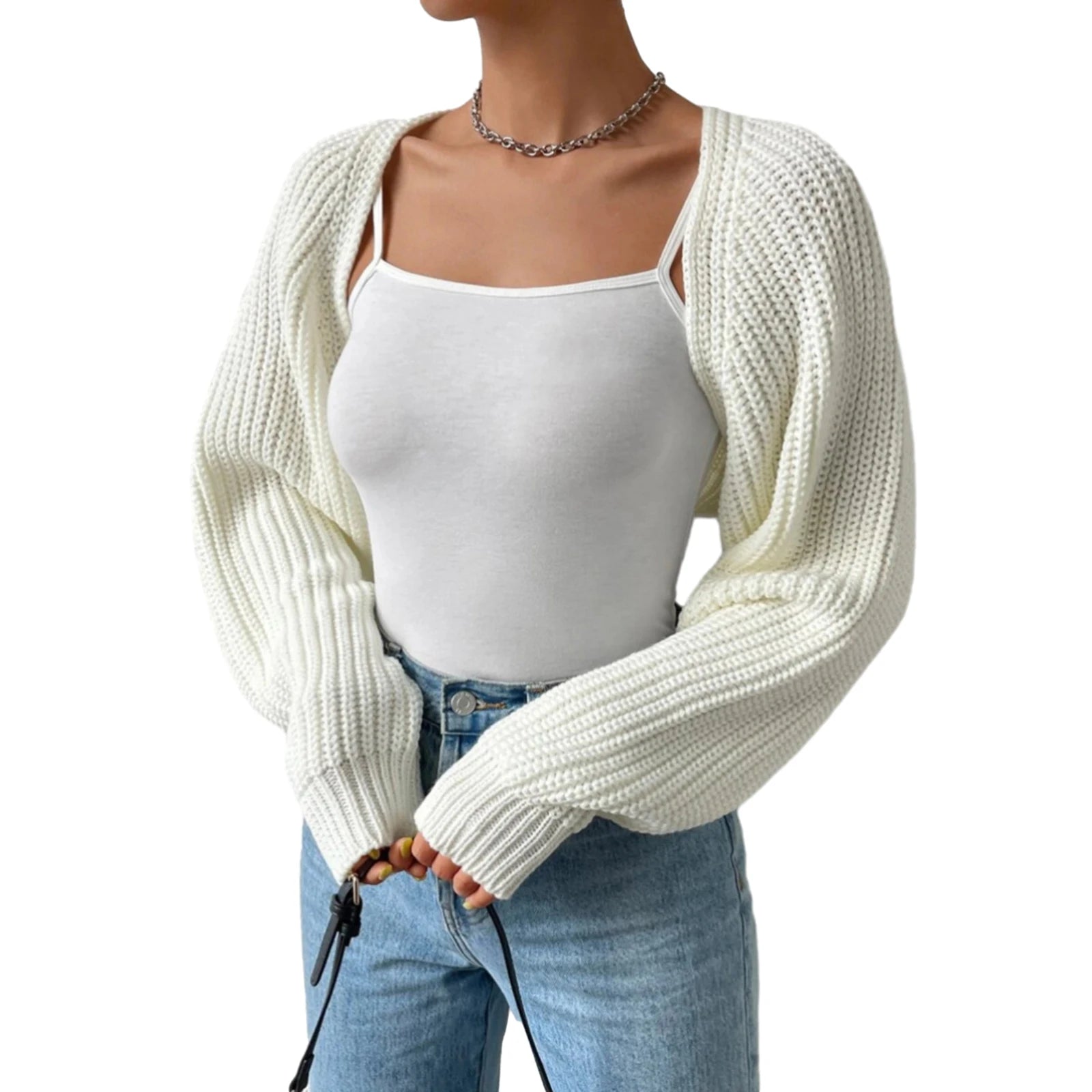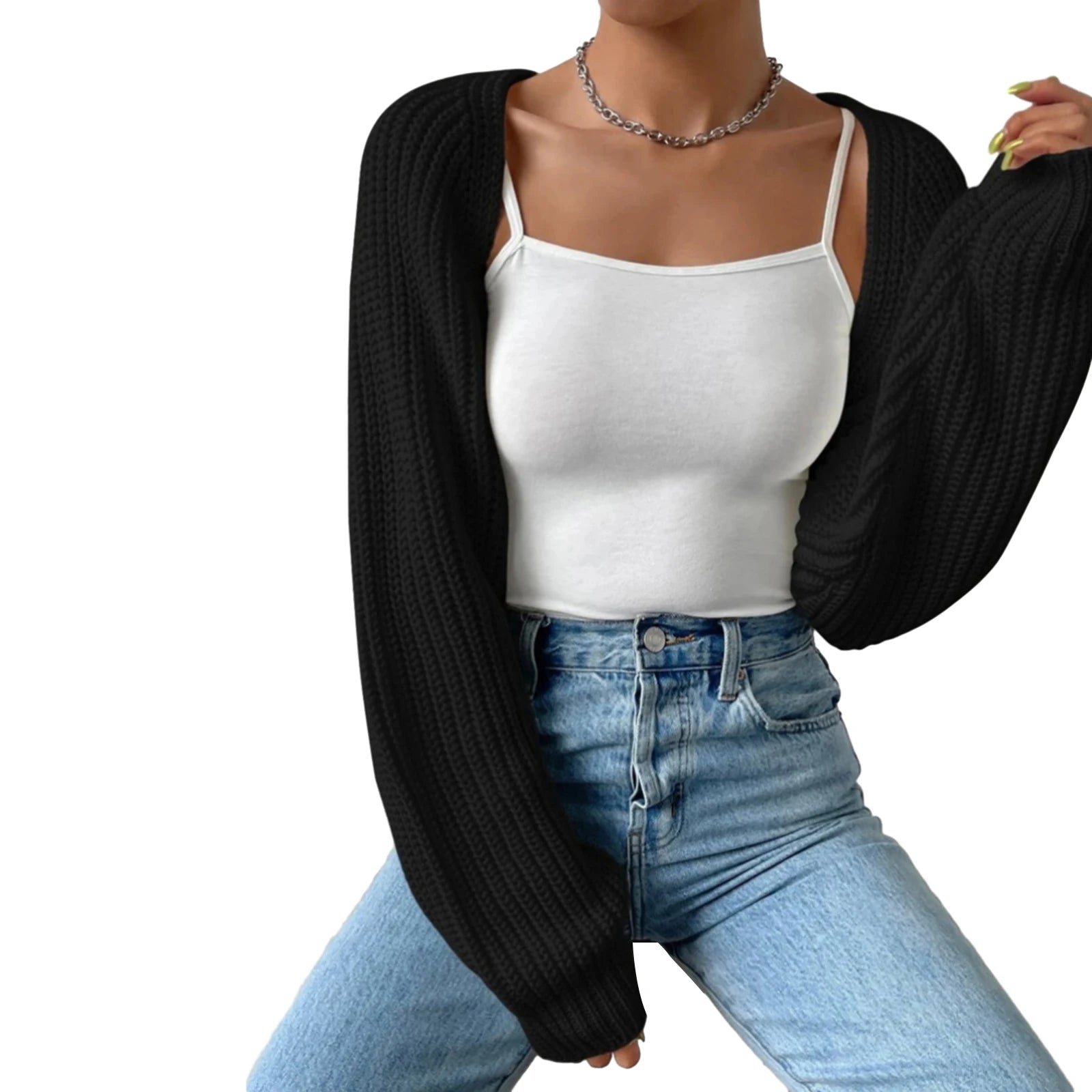 Open Front Cropped Cardigan Women Autumn Winter Long Sleeve Solid Color Ribbed Knit Shrug Sweater Bolero Tops Black/Pink/White