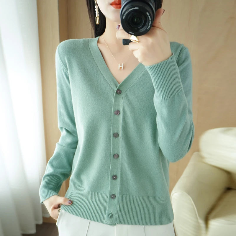 Women 100% Merino Wool Cardigan Soft O-Neck Cashmere Sweater OL Buttoned Knitwear Casual Top Clothing Korean Style
