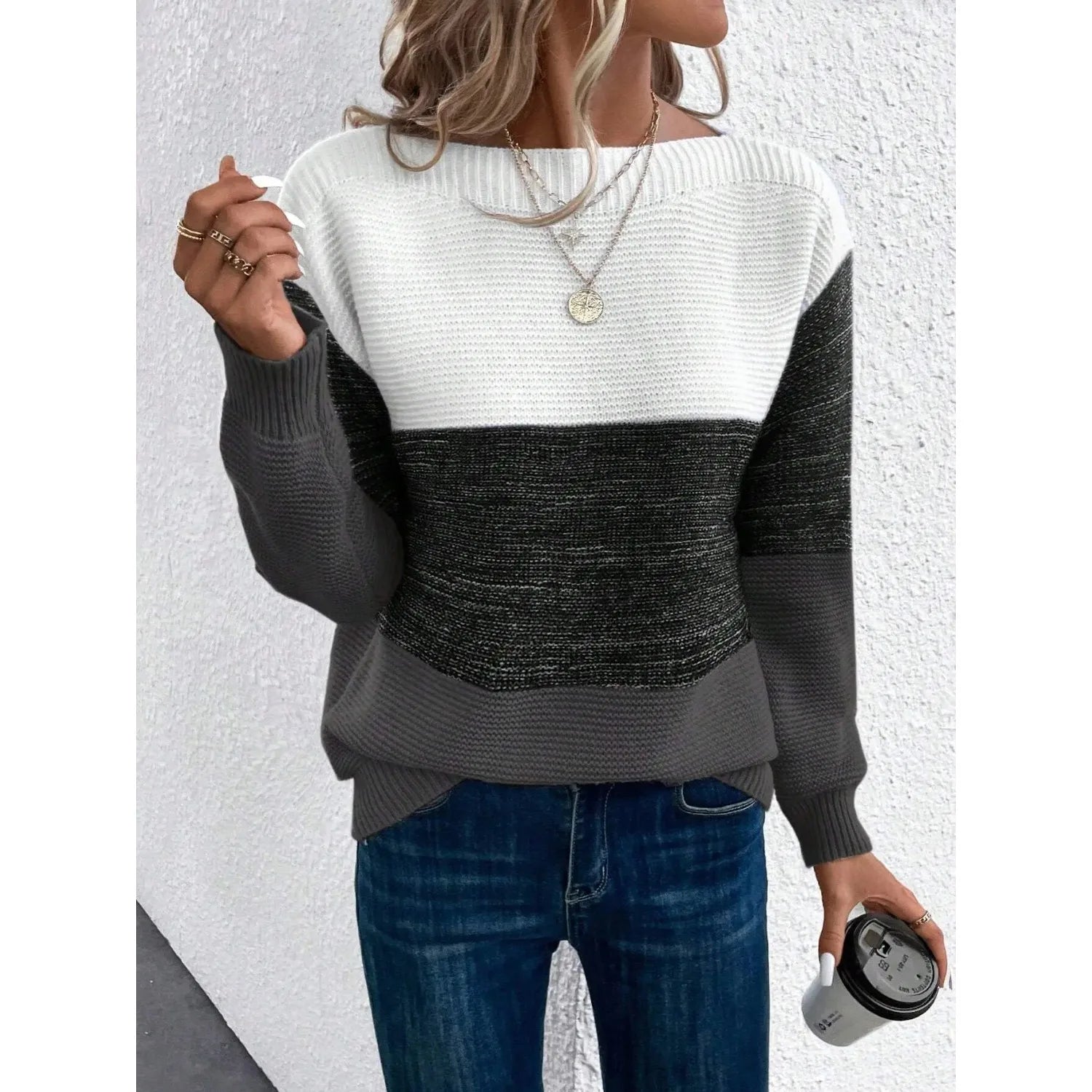 Three-color Patchwork Sweater Women Daily Commuter Casual Loose Jumpers Female Autumn Winter Knitted Thickened Warm Tops
