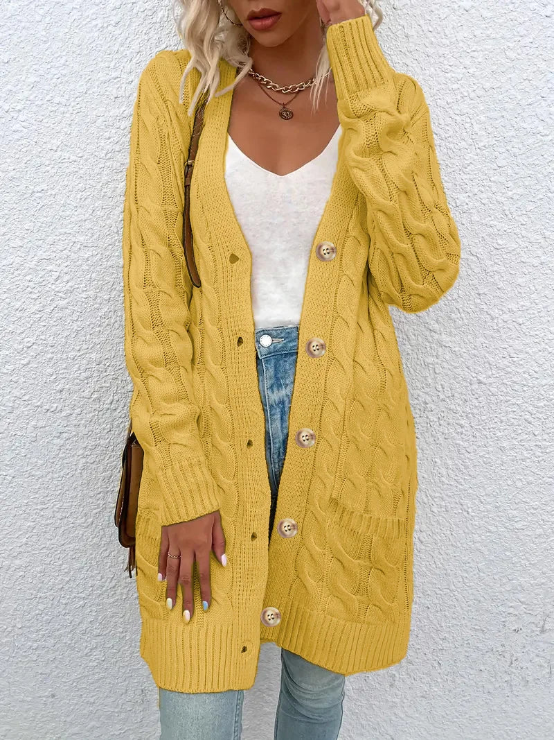 Solid Color Twisted Knit Long Cardigan with Single Buttons, New Vintage Style Pocket Sweater for Women, Suitable for Autumn And