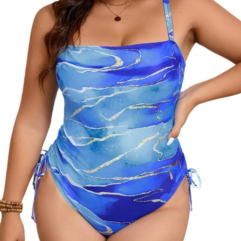 2025 Plus Size Women's Striped Print Drawstring One-Piece Swimsuit
