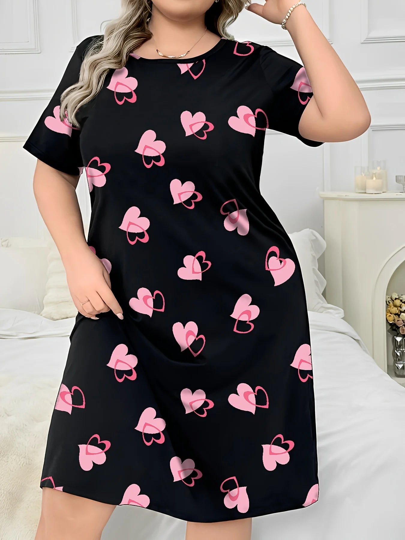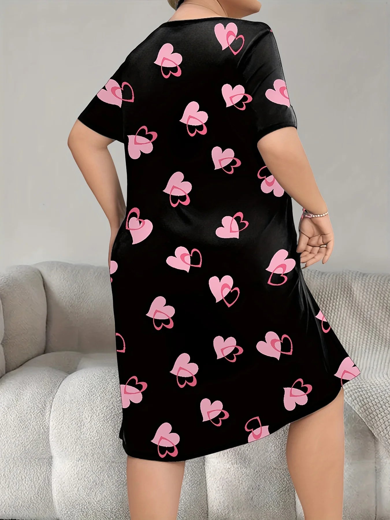 Süßes Loungewear-Kleid für Damen in Übergröße mit Herzprint, Kurzarm, Rundhalsausschnitt, Sommerkleid, lässiges Hauskleid