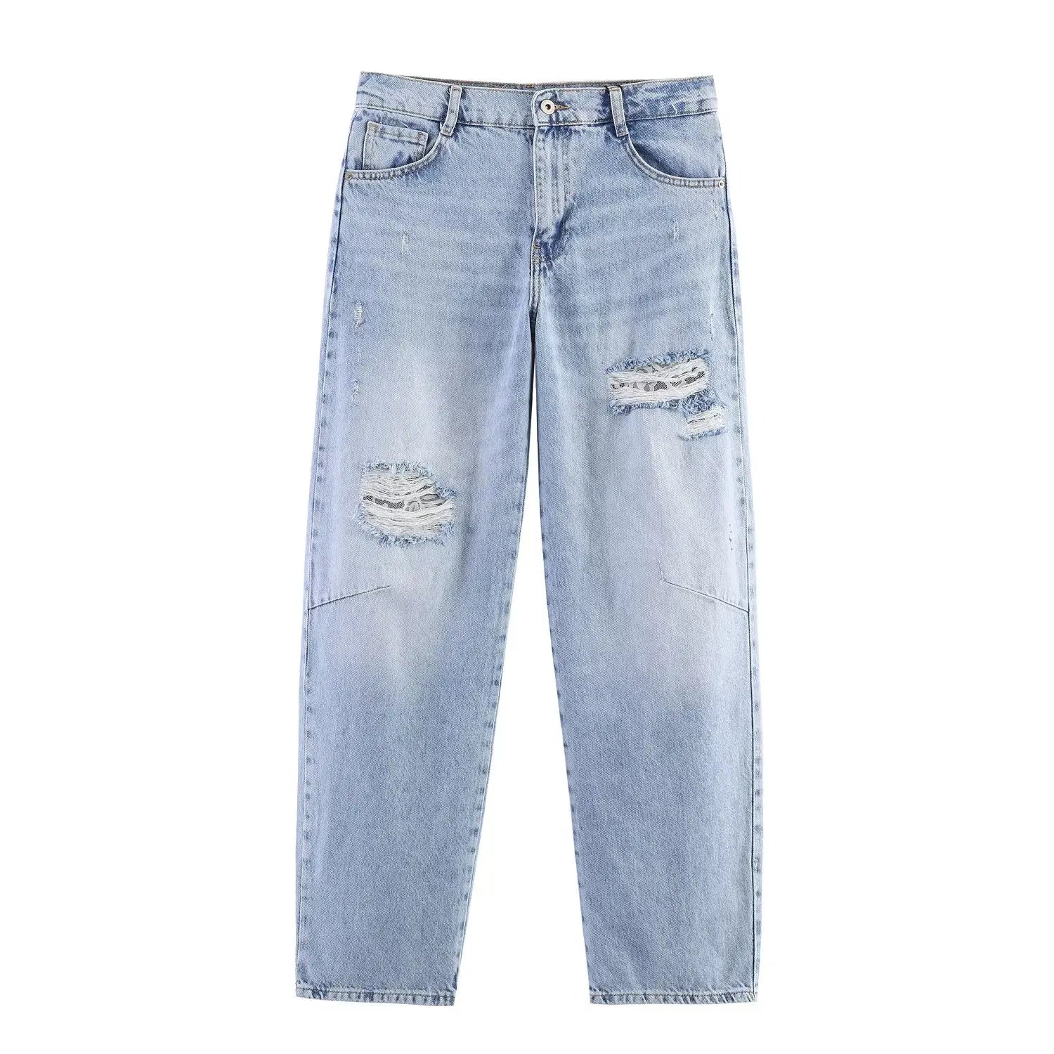 HH Spring Women Chic Lapel Single-breasted Lace Long Sleeve Short Denim Jacket+Loose Mid-rise Hole Decoration Jeans 2-Piece Set