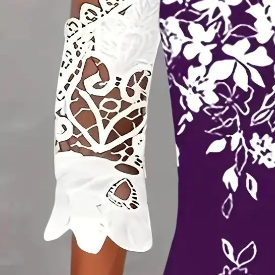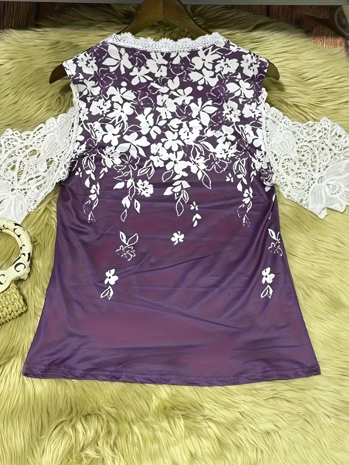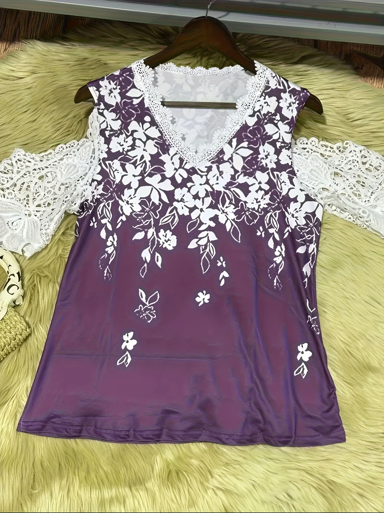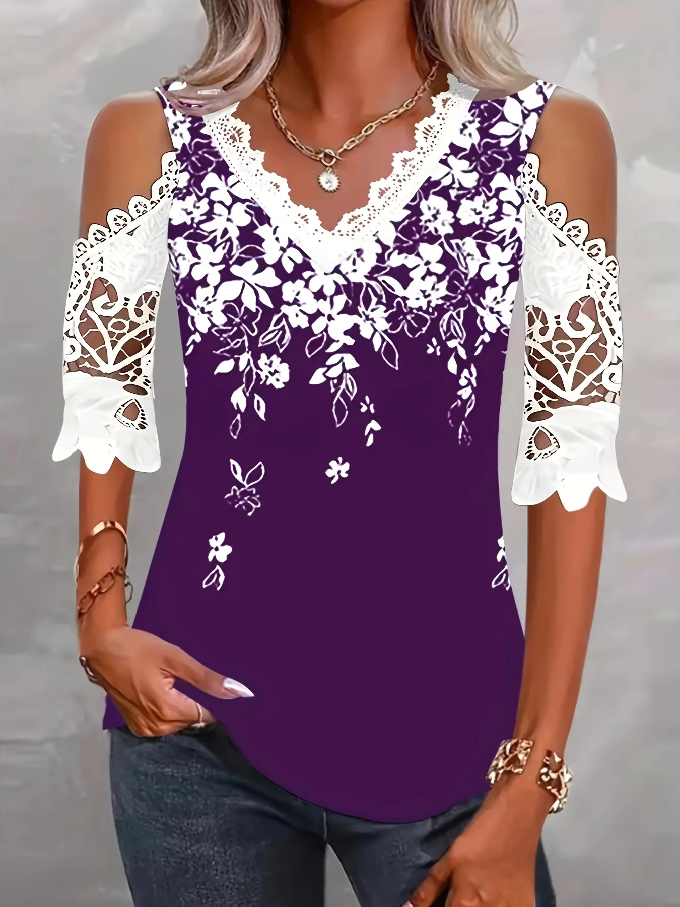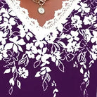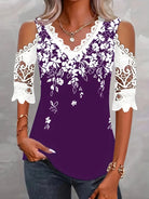 Large size women's fashionable temperament lace patchwork V-neck print off shoulder sleeves lace patchwork top