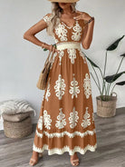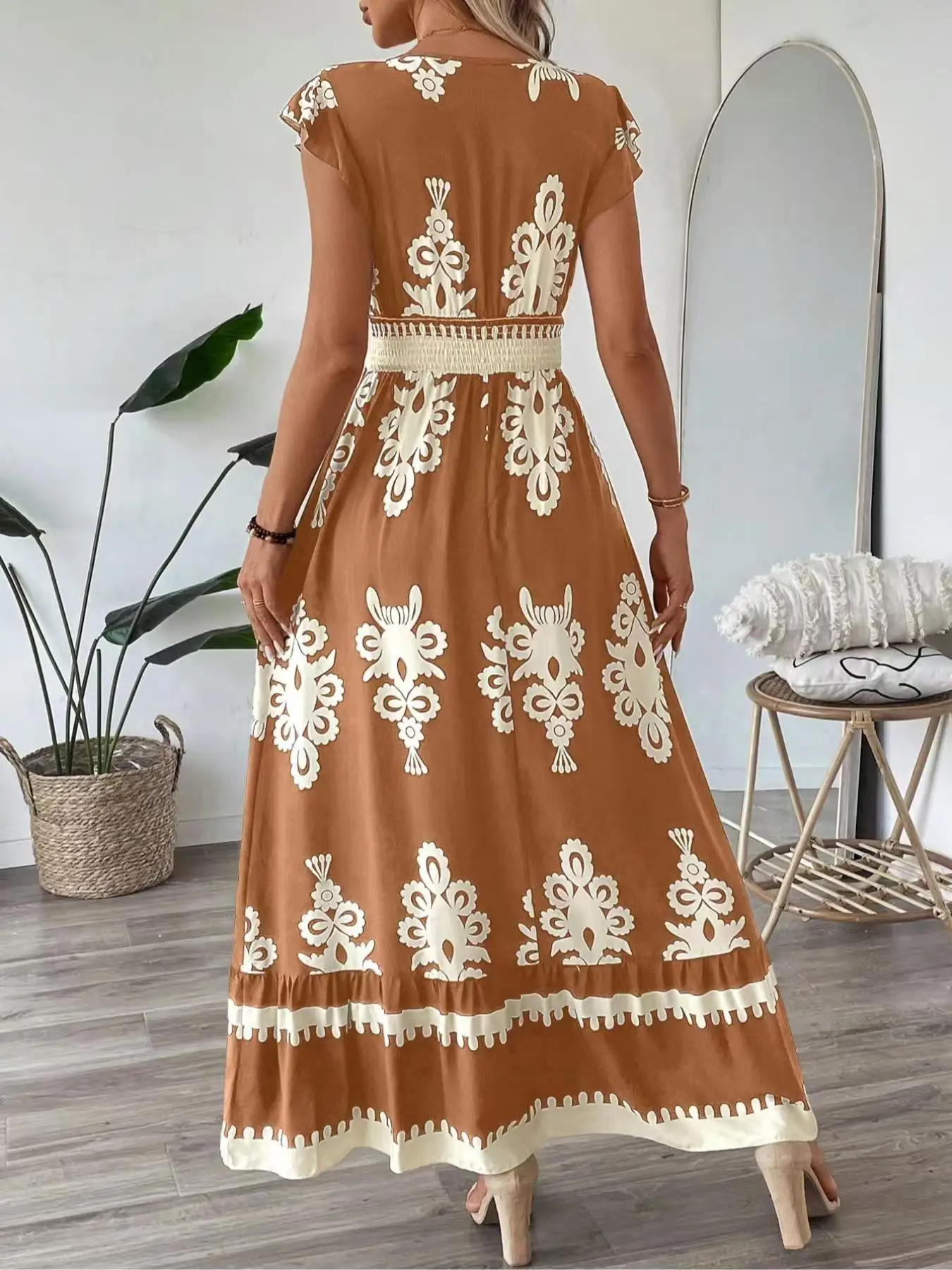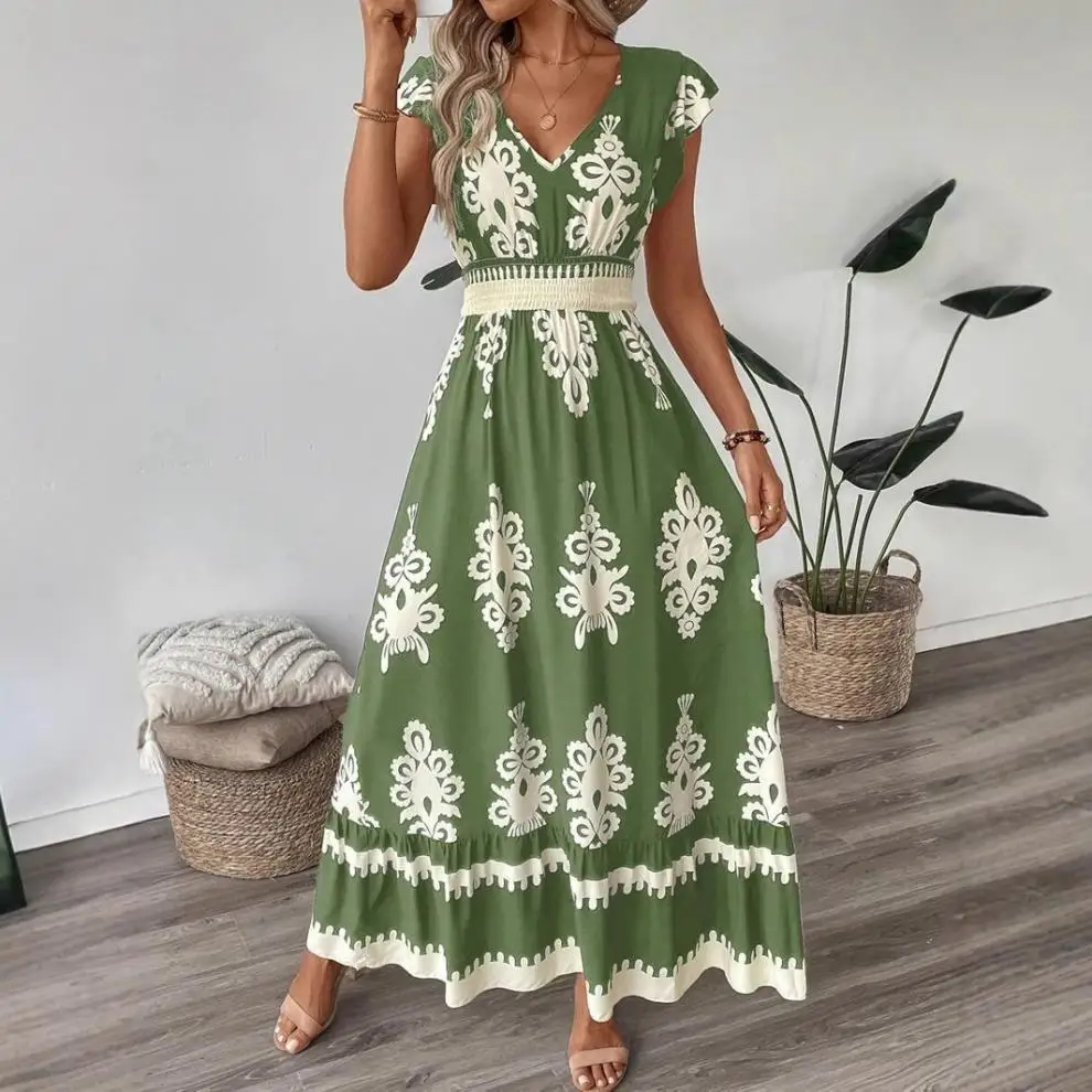 European and American cross-border summer hot sale new fashion print V-neck waist long fly sleeve dress
