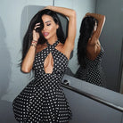 This polka dot halter mini dress features a trendy backless design with off-shoulder and hollow out details, perfect for a fashionable party look.
