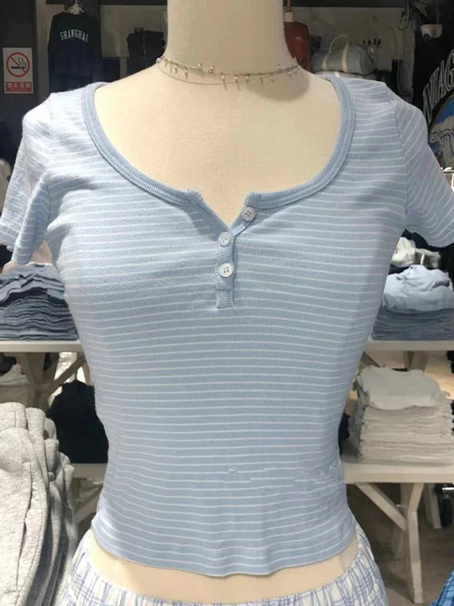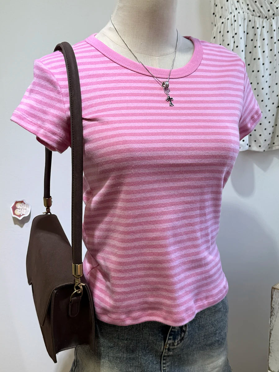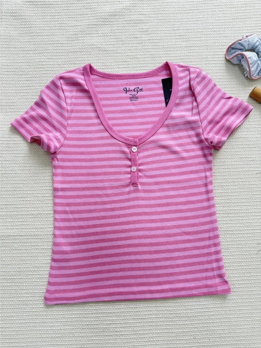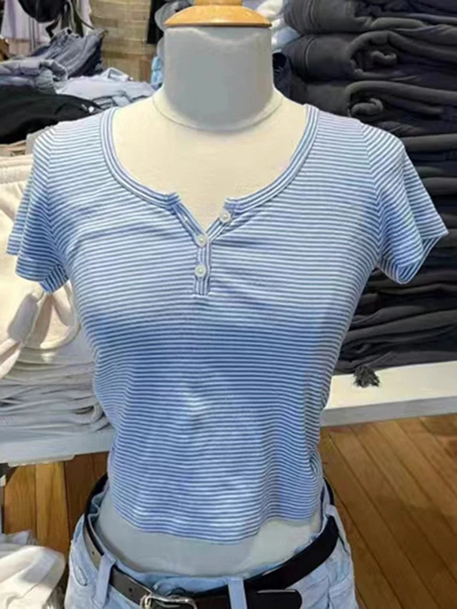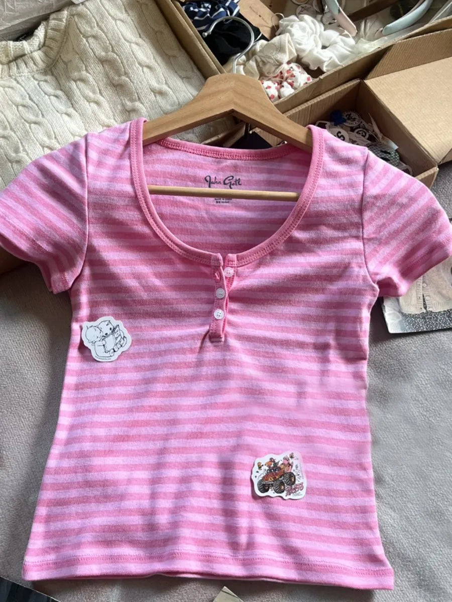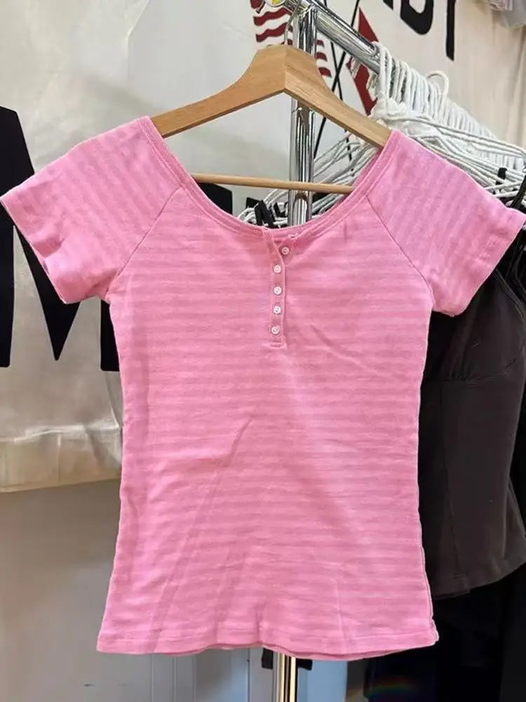 Pink Striped Slim Buttons T-shirts Women New Cotton O-neck Casual Simple Basic Short Sleeve Tees Sweet Cute Girls Tshirt Y2K Top