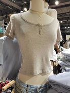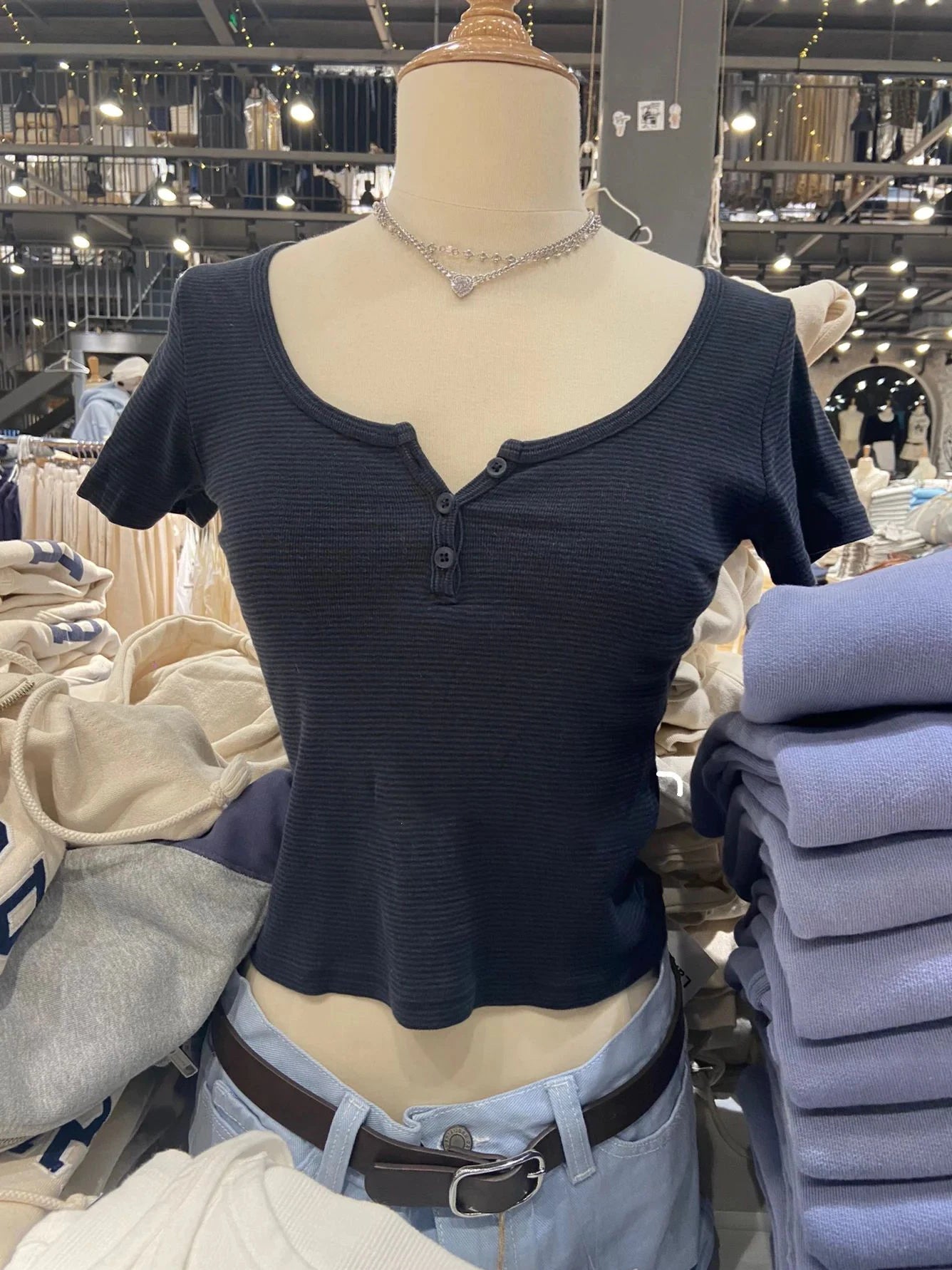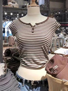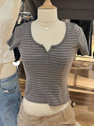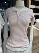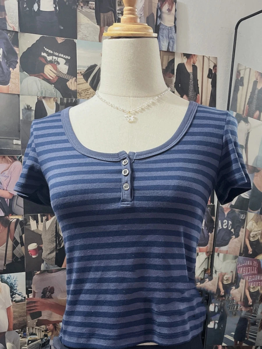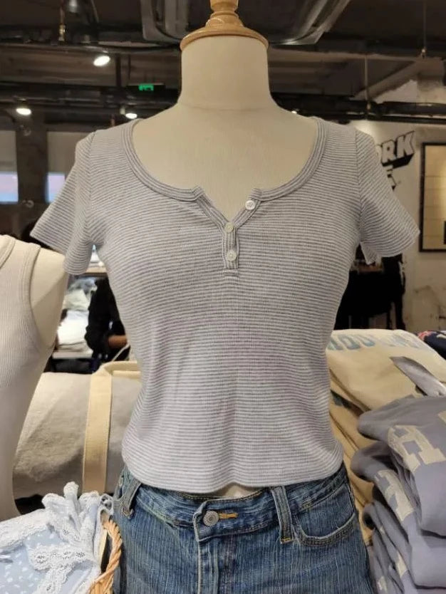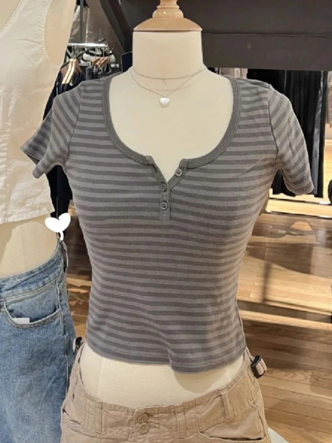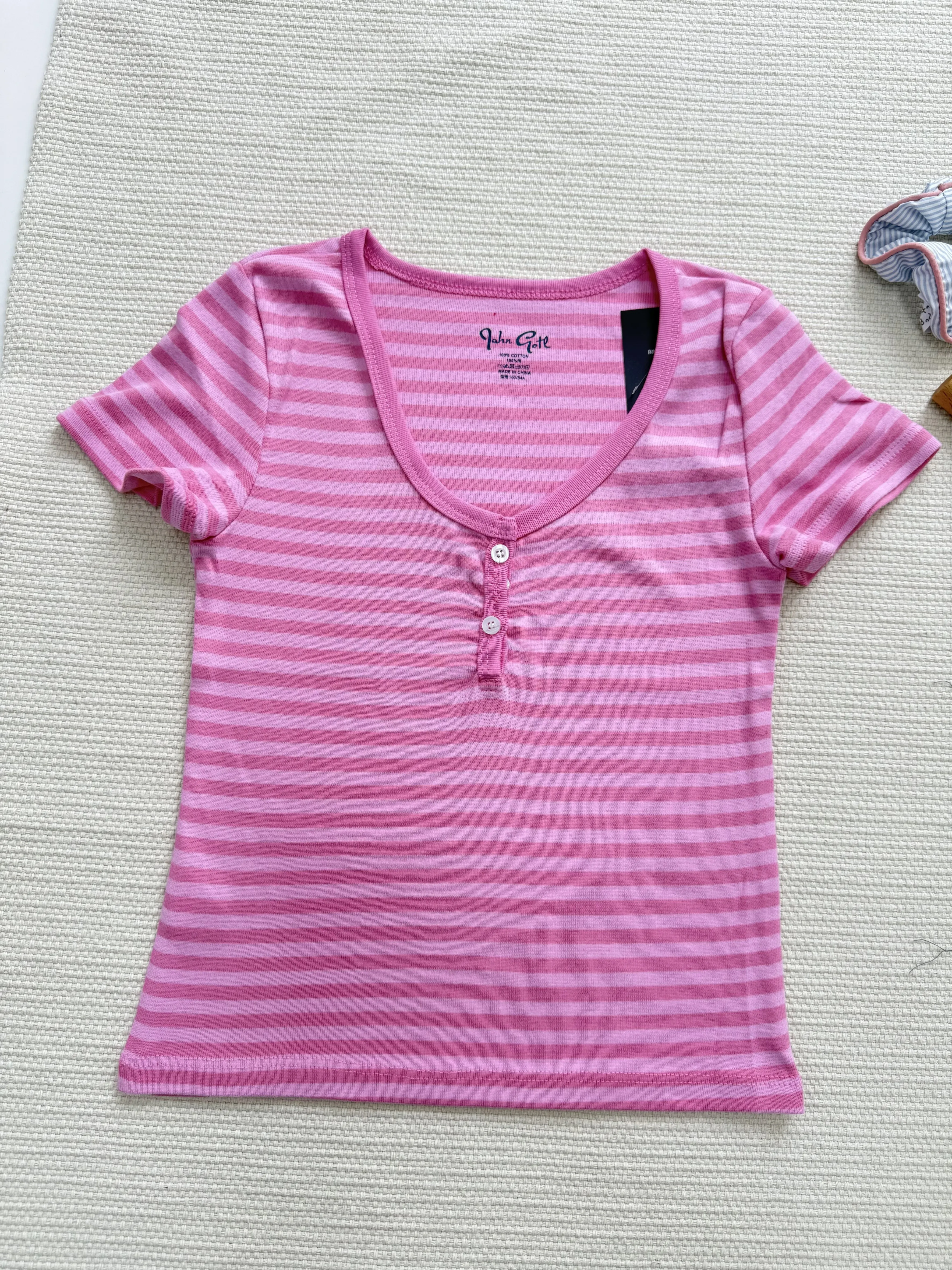 Pink Striped Slim Buttons T-shirts Women New Cotton O-neck Casual Simple Basic Short Sleeve Tees Sweet Cute Girls Tshirt Y2K Top
