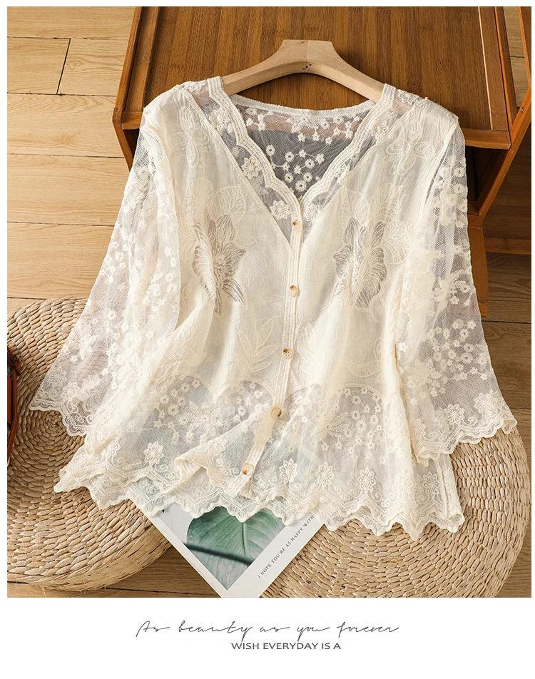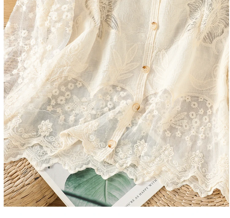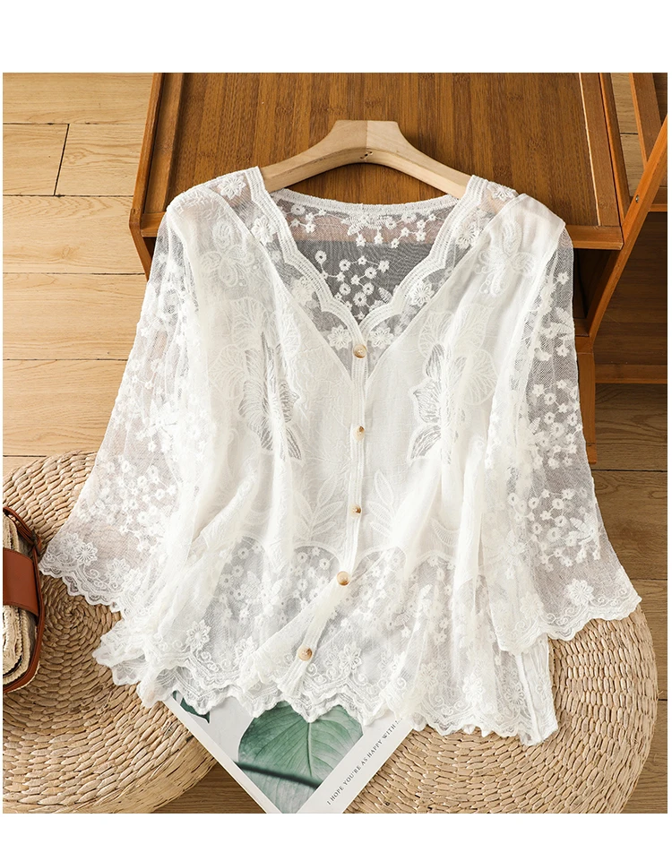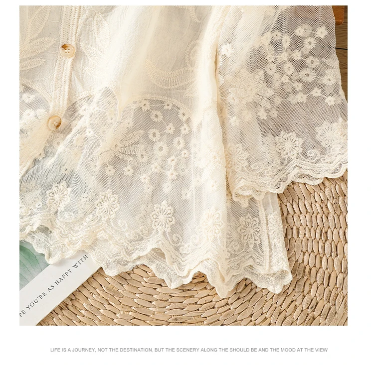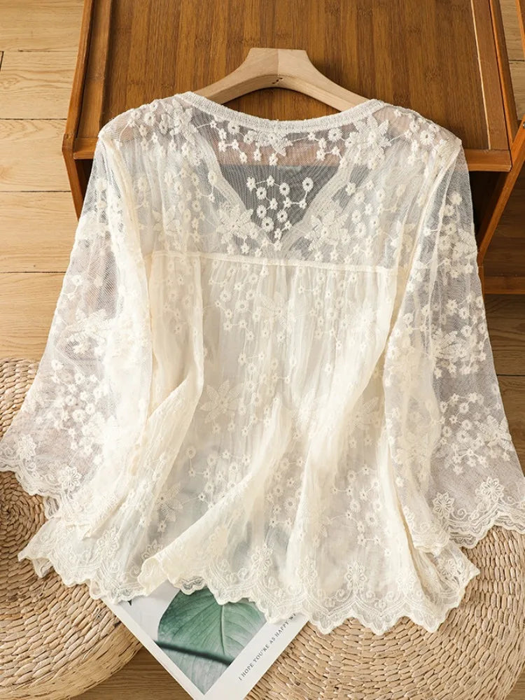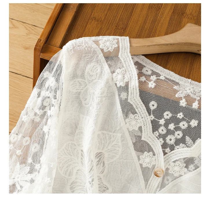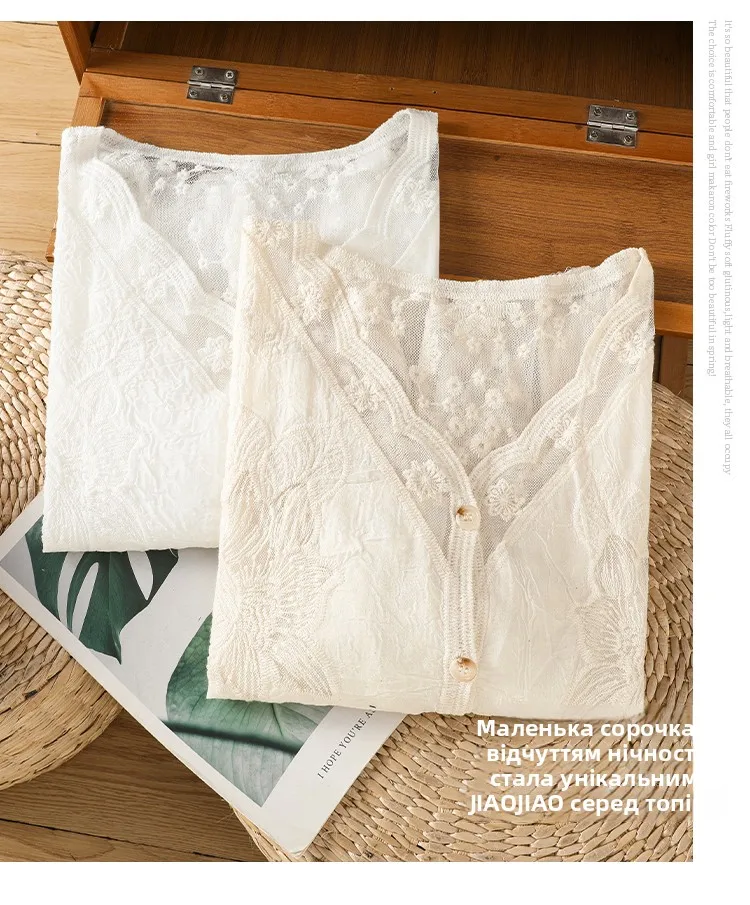 Lace Hollow out V-Ne Sun Protection irt Women's Summer Design Thin Cover up Fairy T Aosphere Ele Top