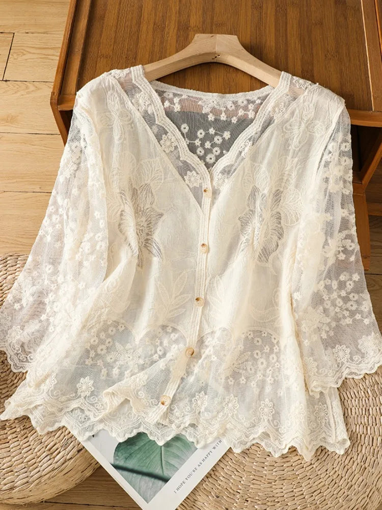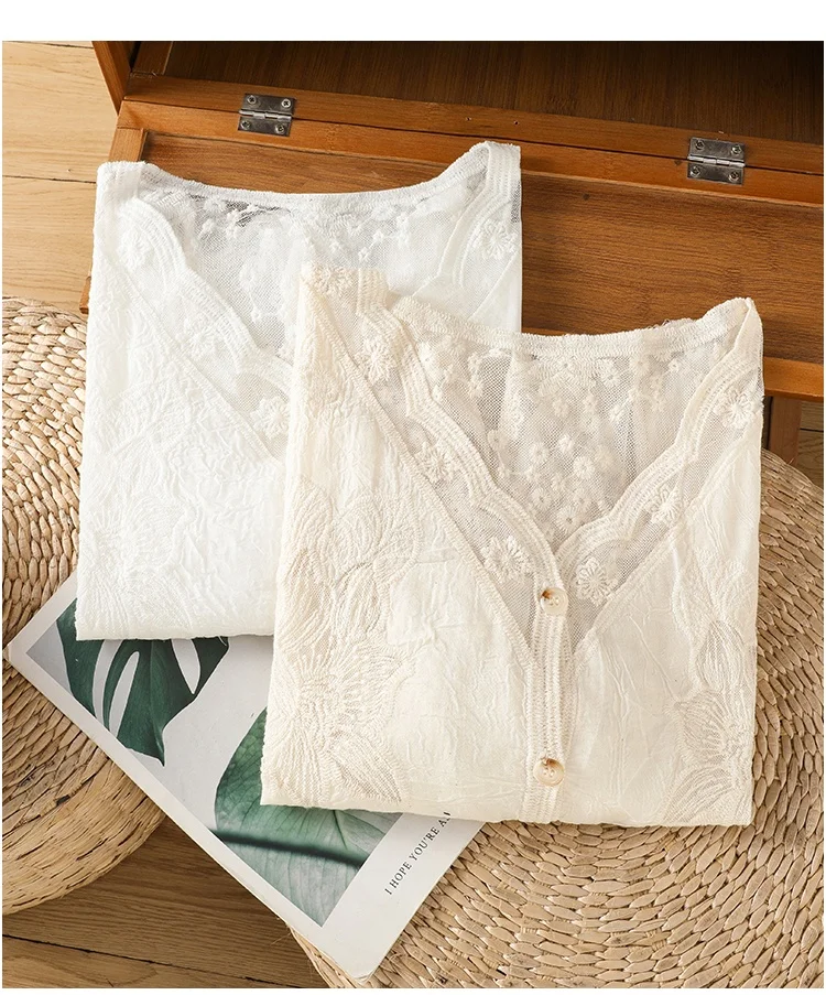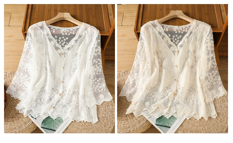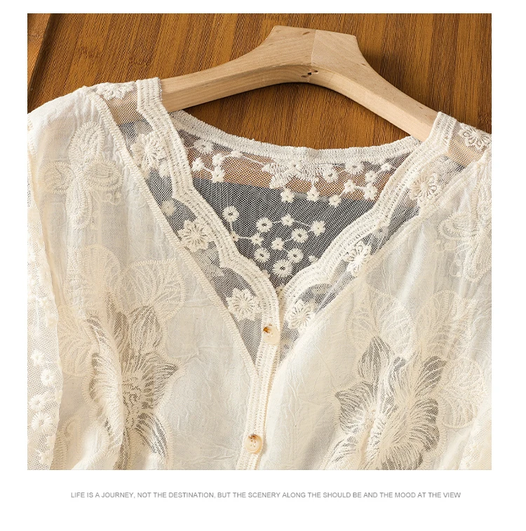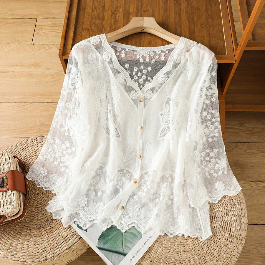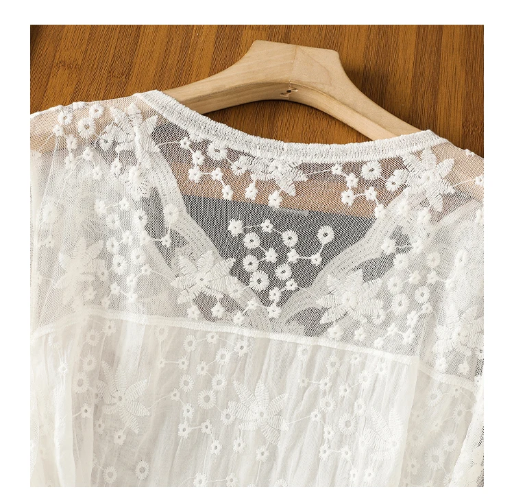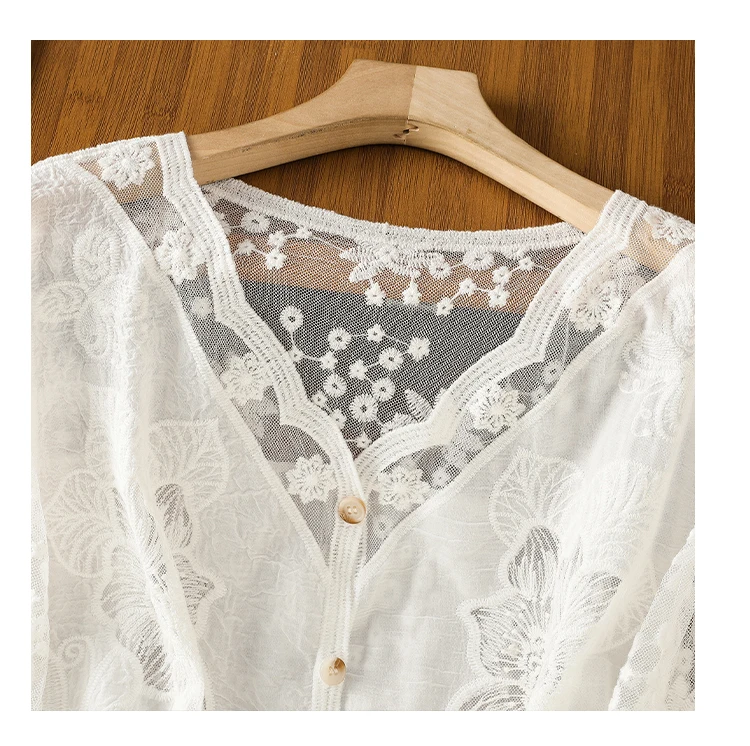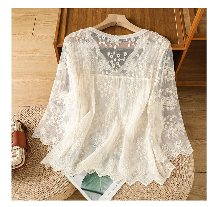 Lace Hollow out V-Ne Sun Protection irt Women's Summer Design Thin Cover up Fairy T Aosphere Ele Top