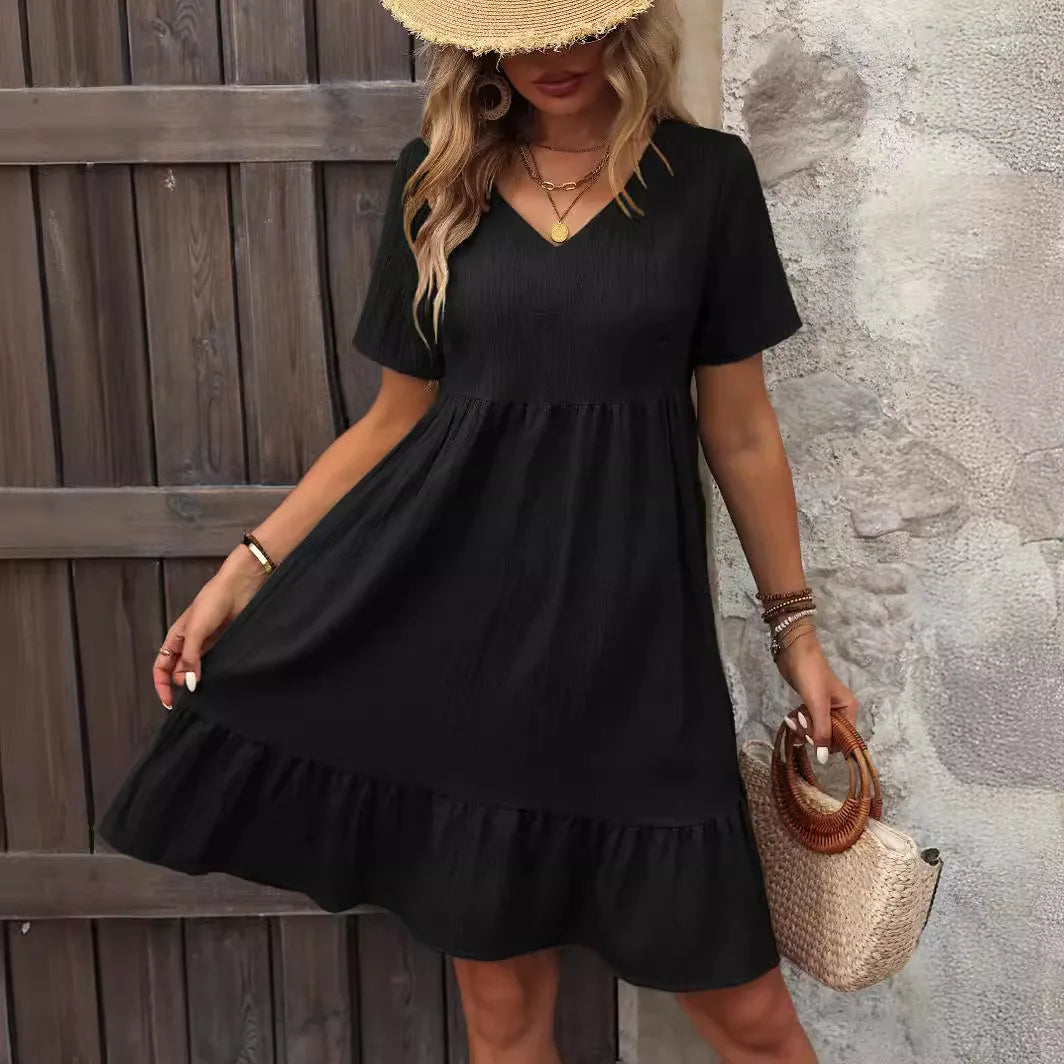New Dresses 2025 Woman Loose V-neck Short Sleeved Pleated Solid Color A-line Beach Elegant Simple Comfortable Skirt
