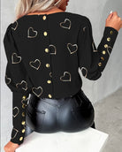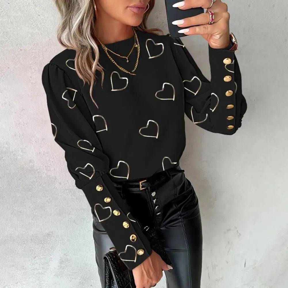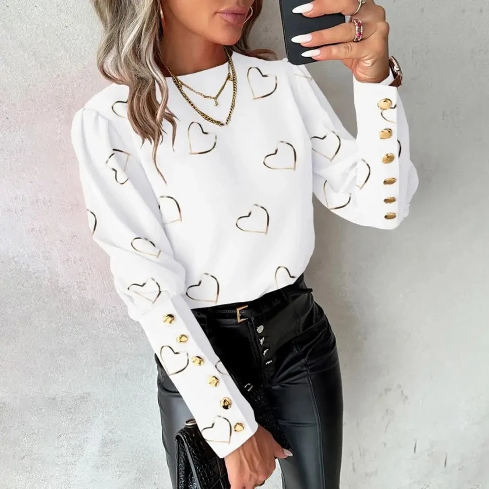 2025 Women Spring Shirts Heart Print Round Neck Long Sleeve Loose Blouses Fashion Casual Button Elegant Office Ladies Tops