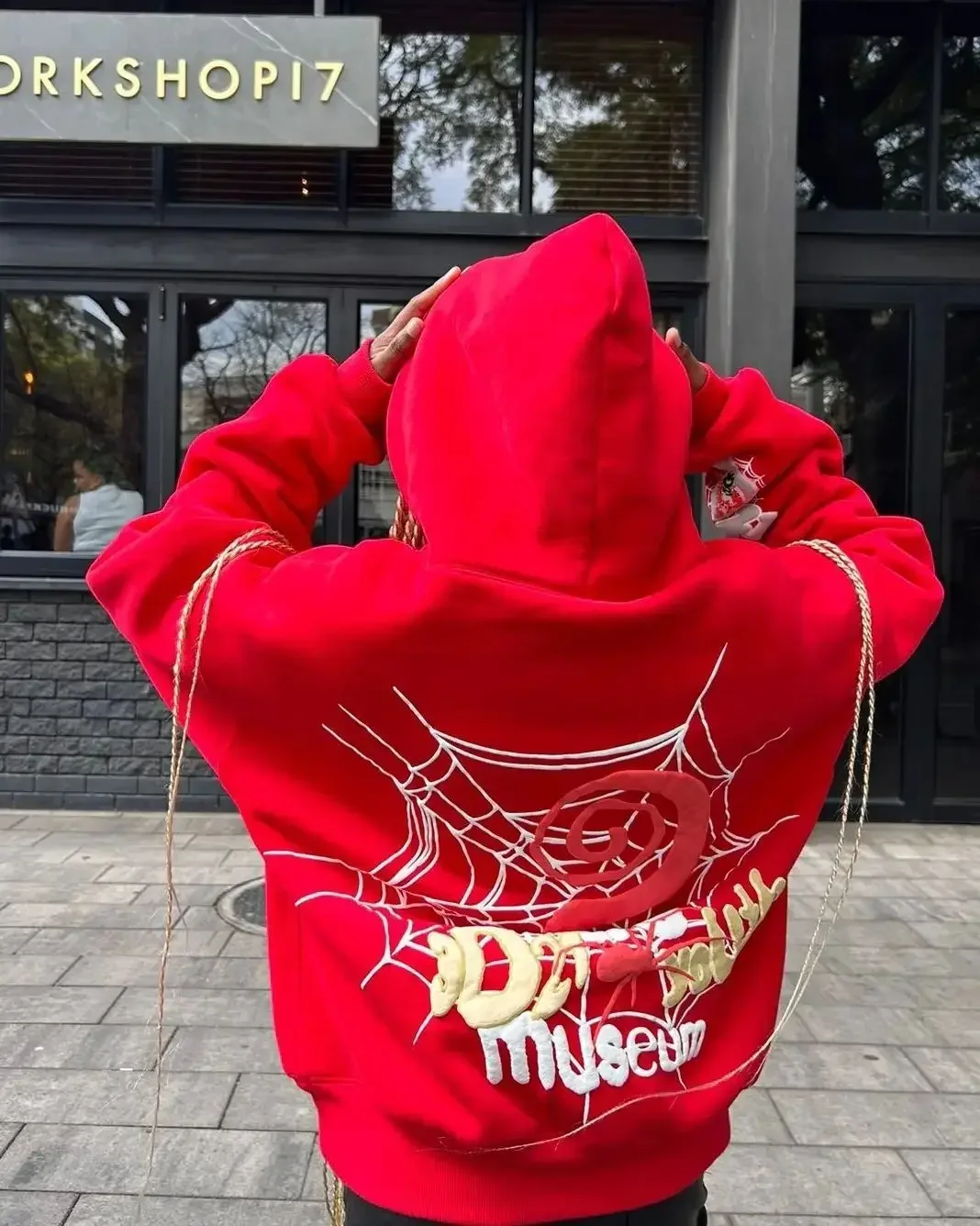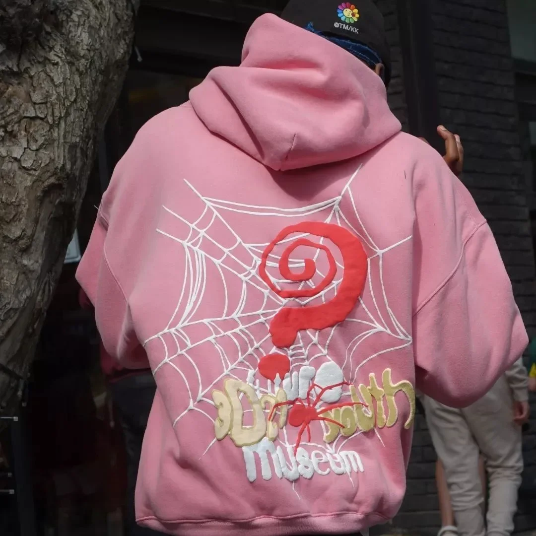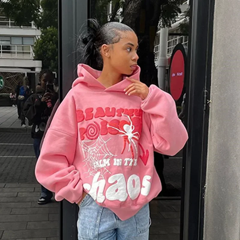 New Autumn Winter Hooded Sweatshirt Letter Spider Web Print Loose Hip Hop Men's Trendy Streetwear Casual Comfortable Top
