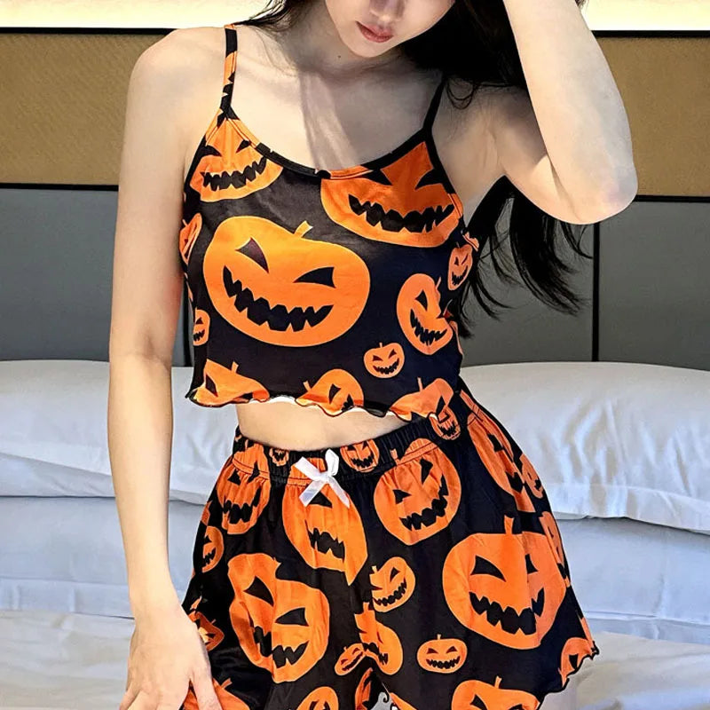 Night Wear Women Sexy Halloween Pajamas Pumpkin Print Set Slip Loungewear Large Size 2 Piece Set Sleeveless Sleepwear Suspender