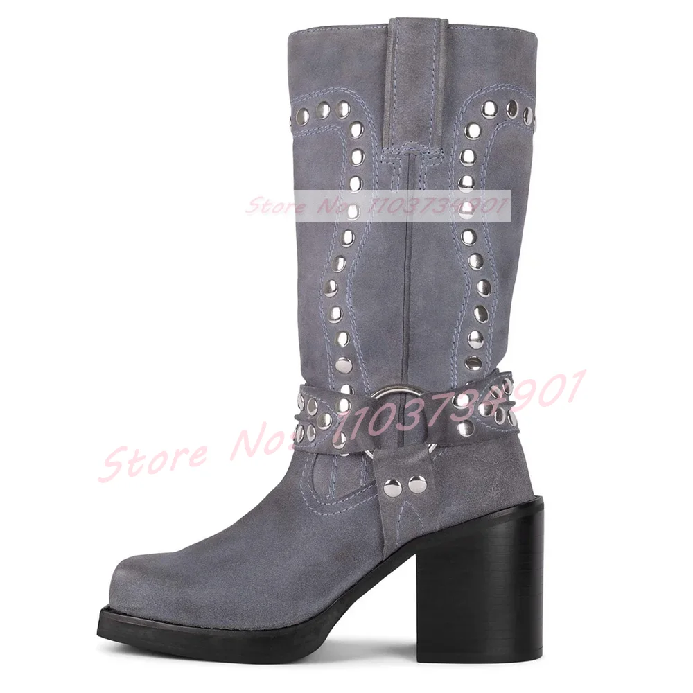 Rivets Mid Calf Square Toe Western Boots Women Chunky High Heel Studded Boots Ladies Flock Retro Fashion Sexy Novelty Shoes