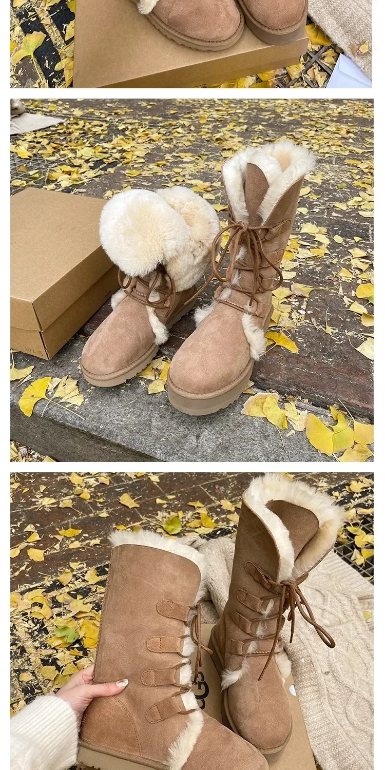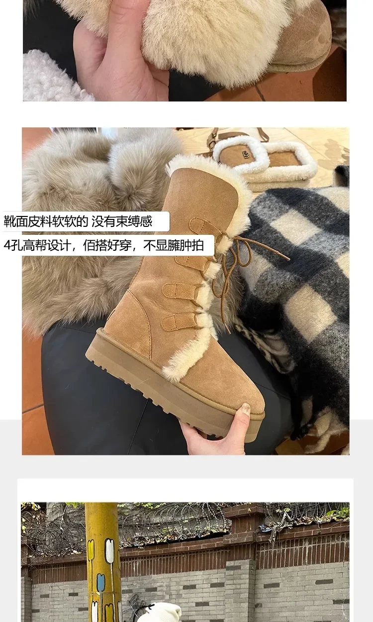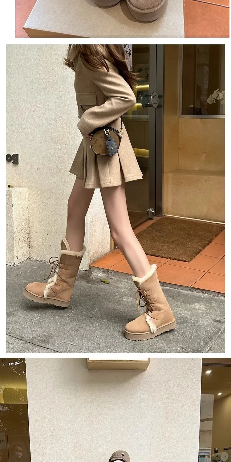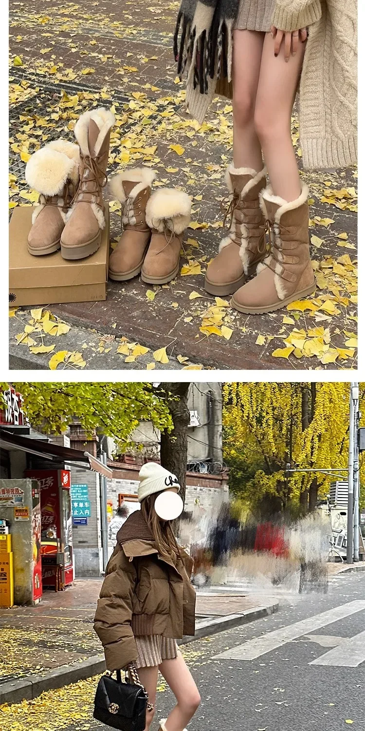 Winter Warm Plush Cotton Shoes Women Outdoor Lace Up Casual Snow Boots Anti-slip Ethnic Thick Sole Soft Long Boots 2024