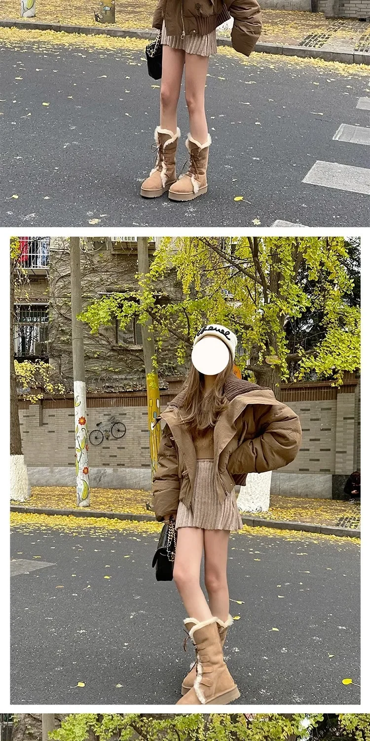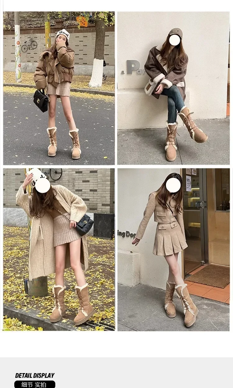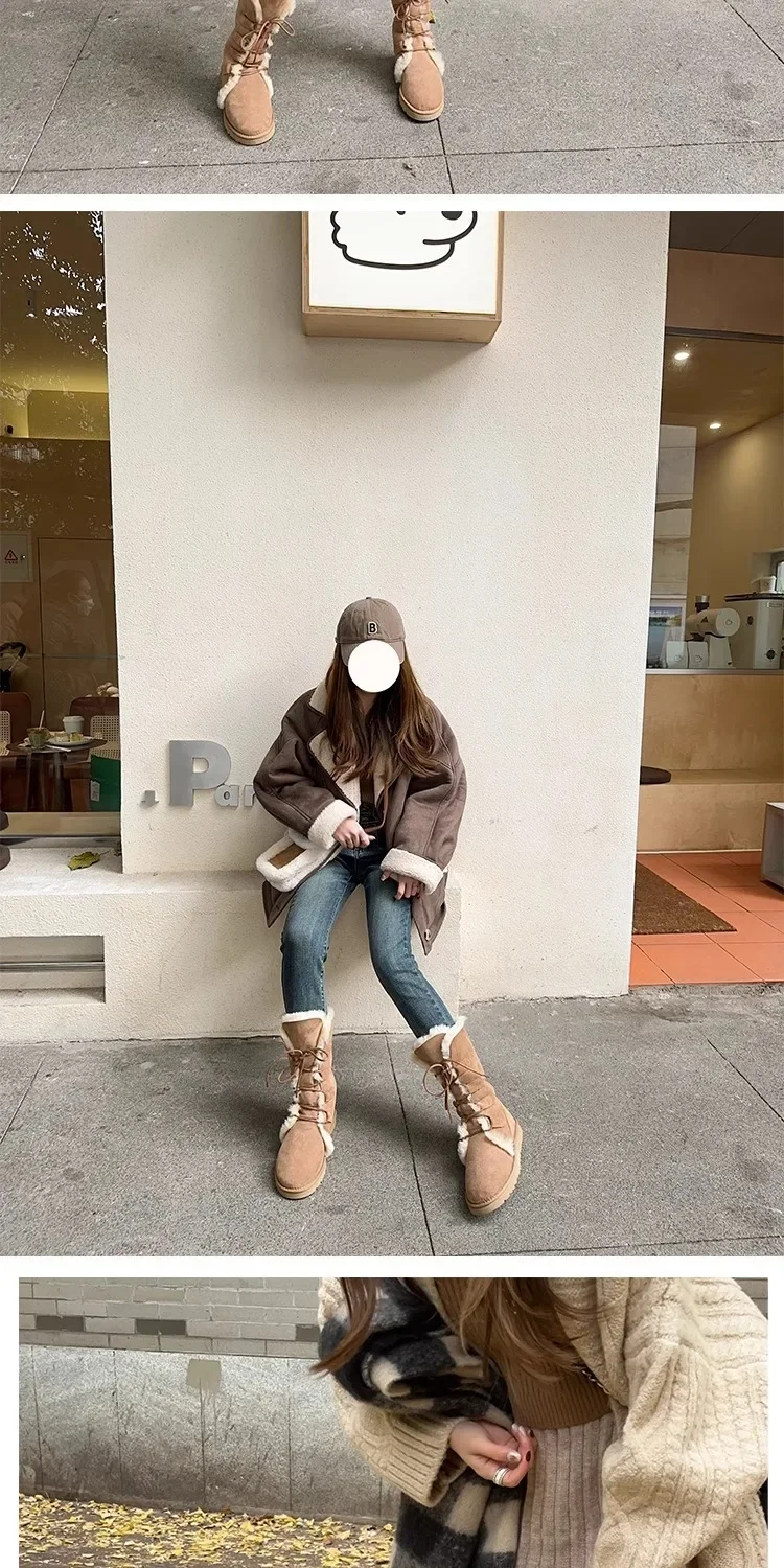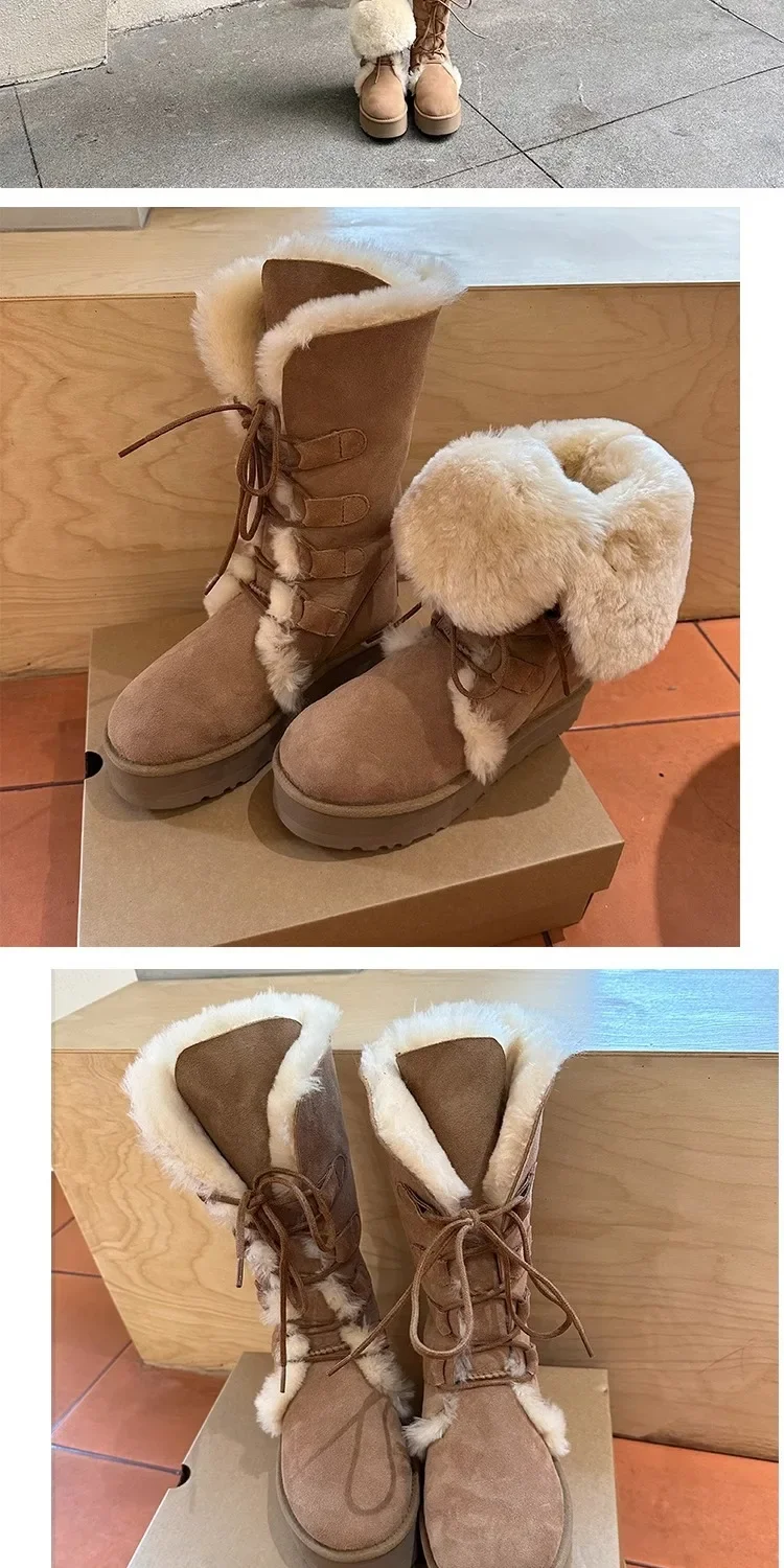 Winter Warm Plush Cotton Shoes Women Outdoor Lace Up Casual Snow Boots Anti-slip Ethnic Thick Sole Soft Long Boots 2024